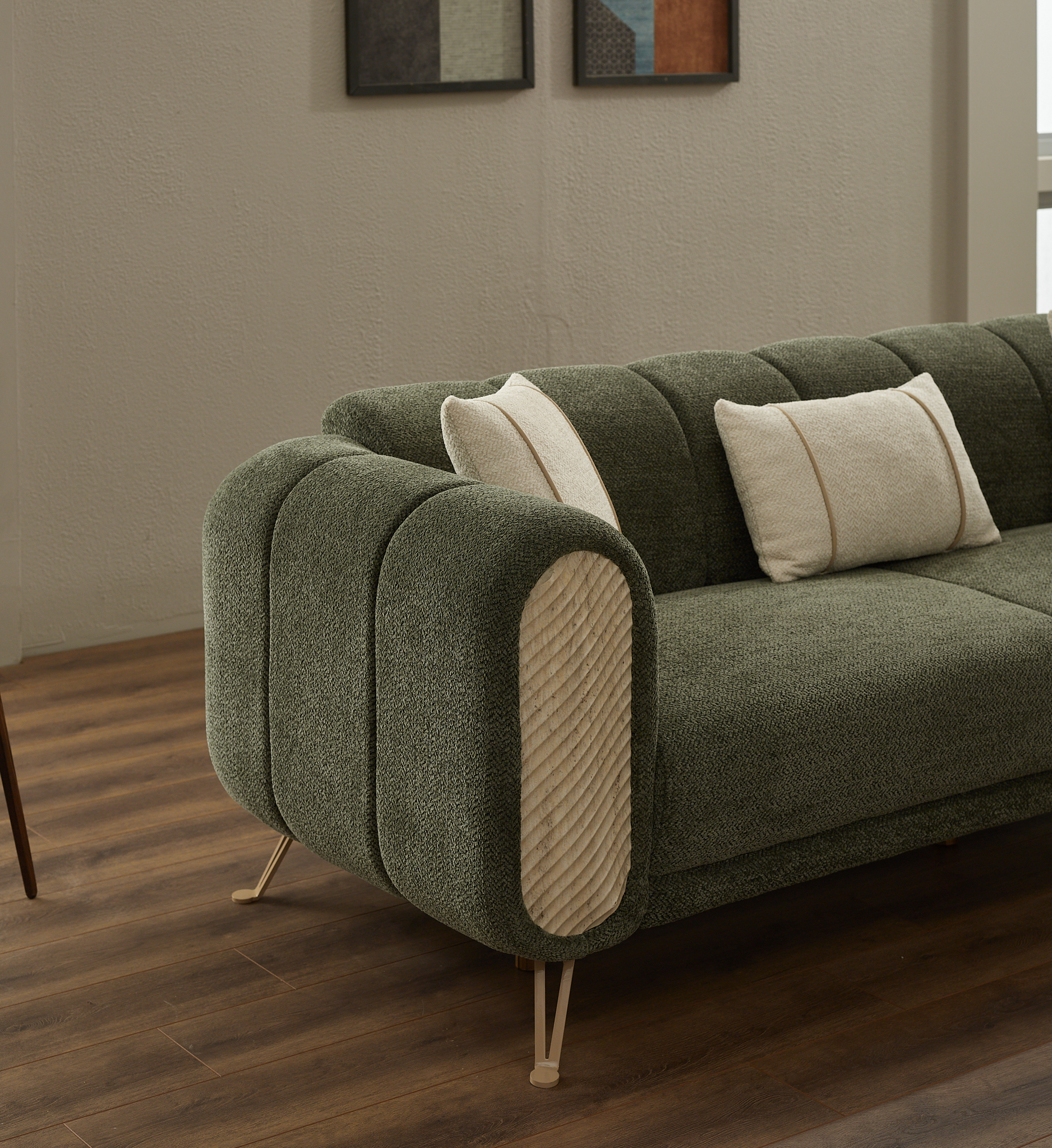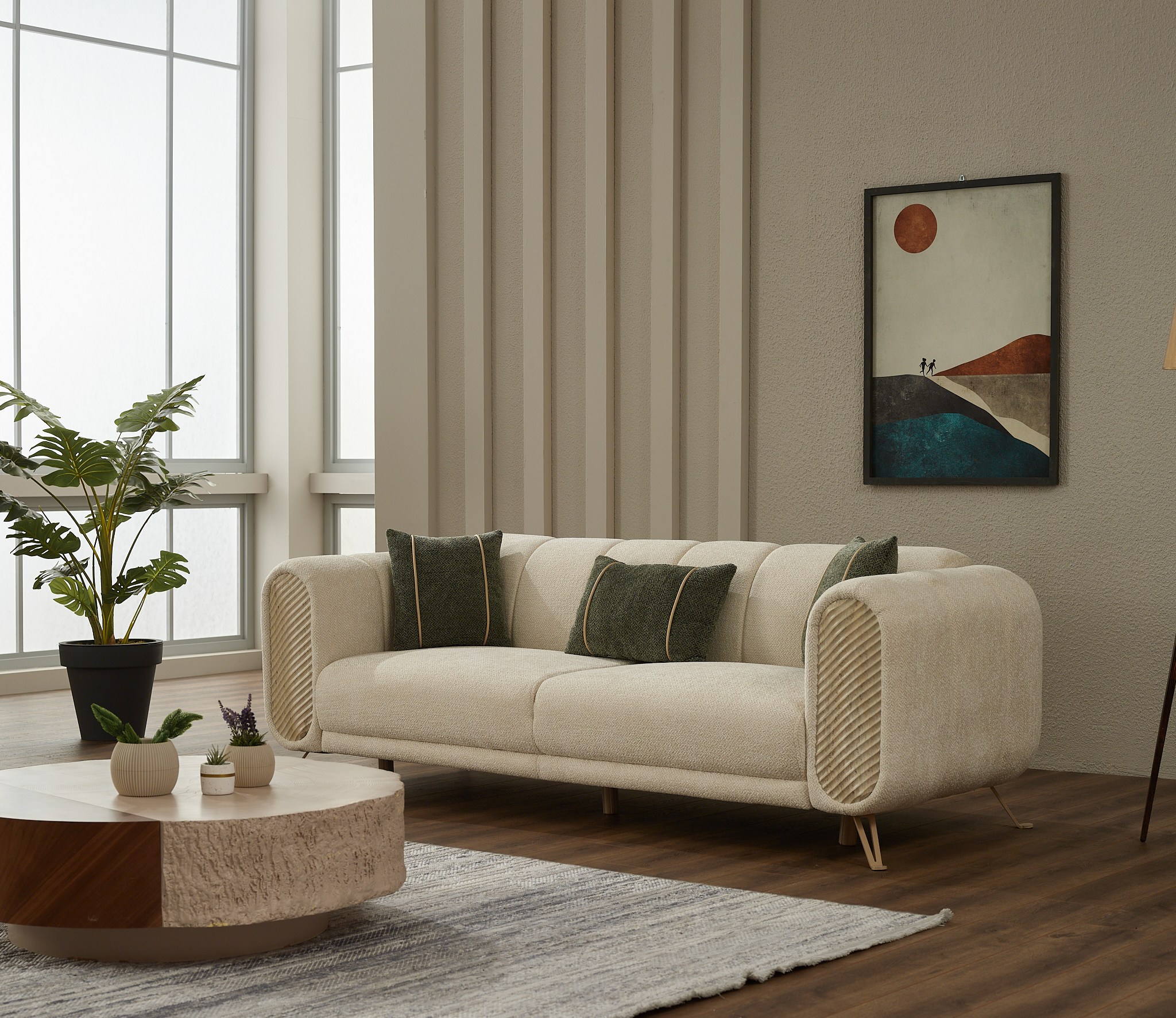 Revêtus d’un tissu doux et texturé aux tons naturels, les assises offrent une sensation chaleureuse et apaisante. Les formes arrondies et les finitions soignées apportent une touche contemporaine tout en garantissant un excellent maintien. Les coussins inclus ajoutent du confort supplémentaire et une note décorative subtile.