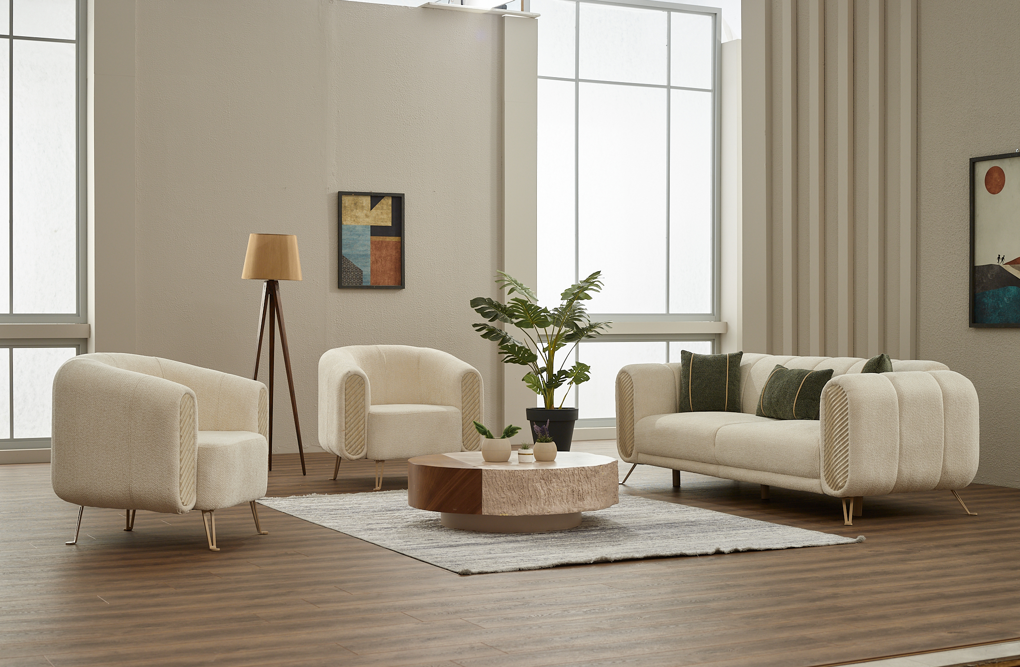 Idéal pour recevoir ou pour vos moments de détente, cet ensemble de salon crée une atmosphère harmonieuse, lumineuse et sophistiquée.