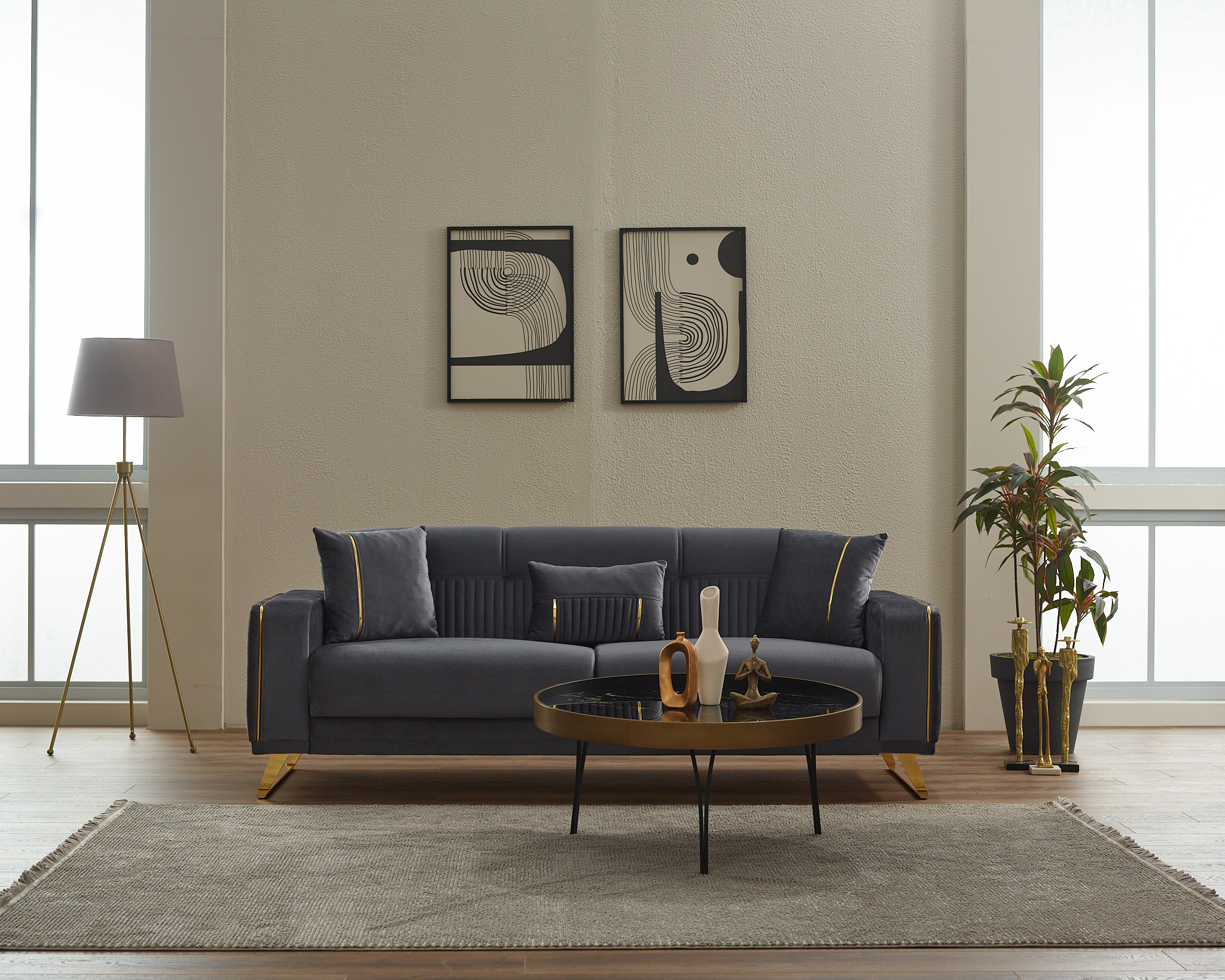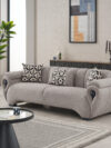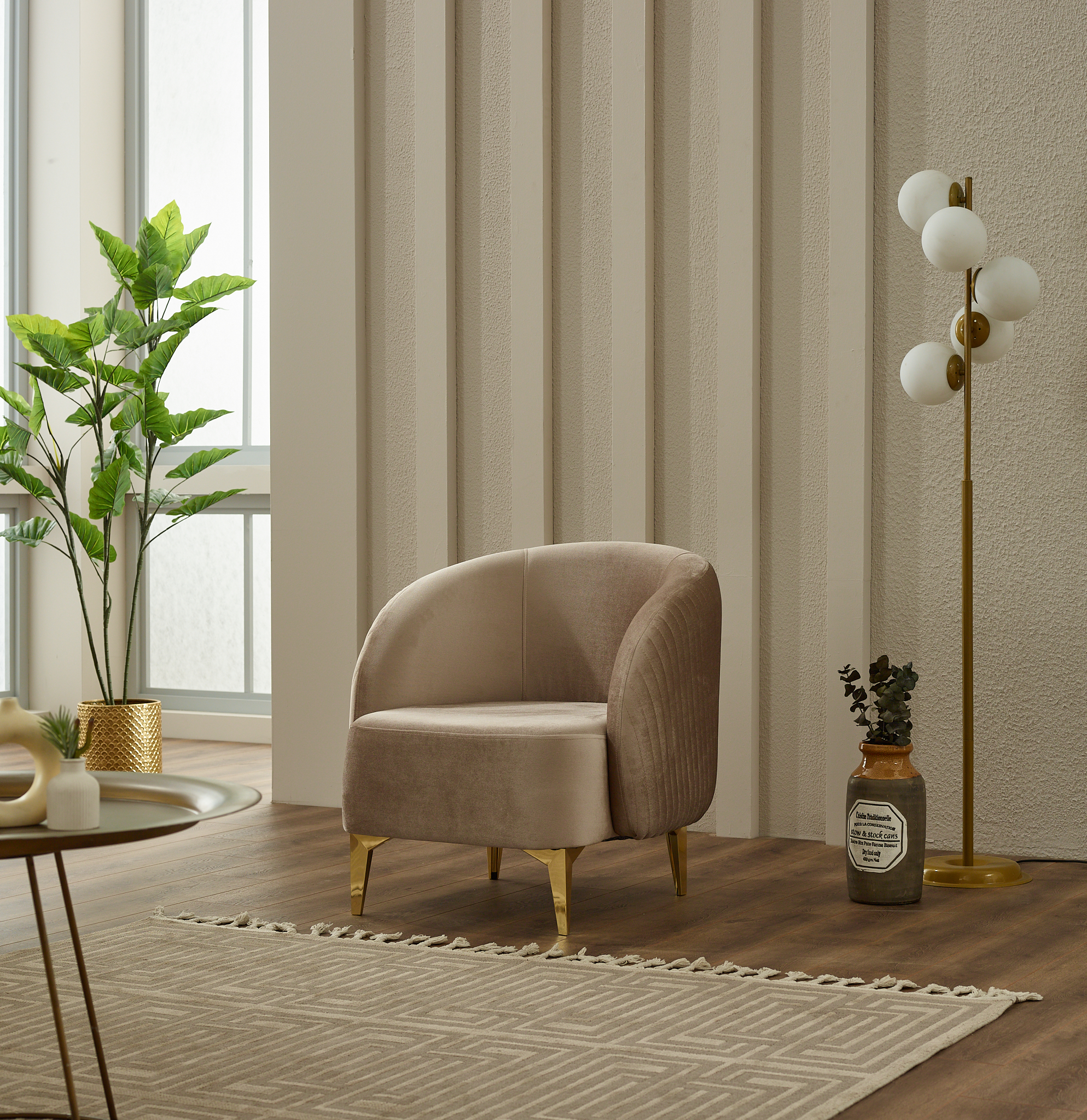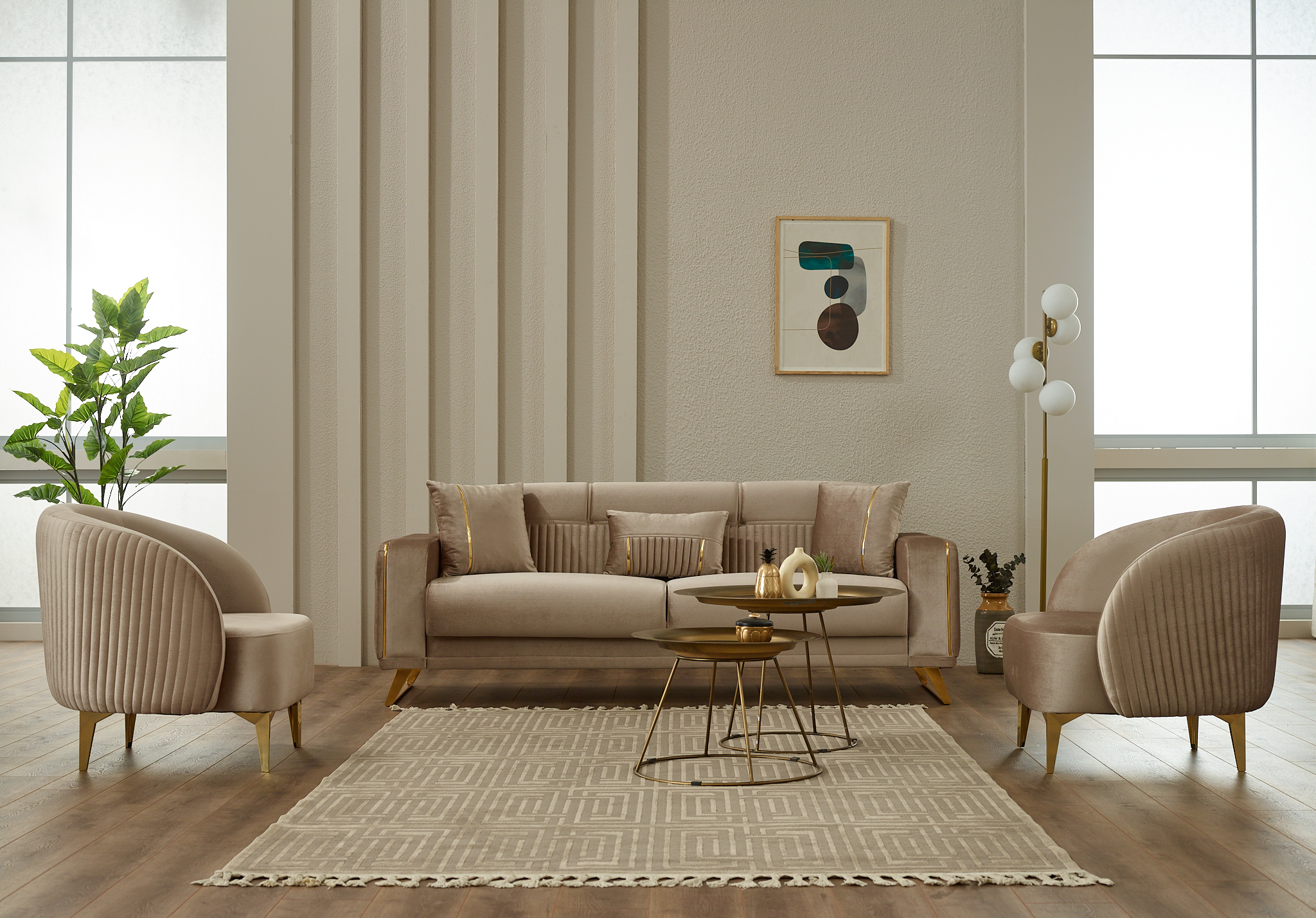 Le revêtement doux au toucher, dans une teinte chaleureuse et naturelle, crée une ambiance accueillante et sophistiquée. Les accoudoirs travaillés avec panneaux texturés et inserts décoratifs, ainsi que les pieds métalliques dorés, soulignent le caractère moderne du modèle. Les coussins assortis inclus améliorent le confort tout en renforçant l’harmonie visuelle.