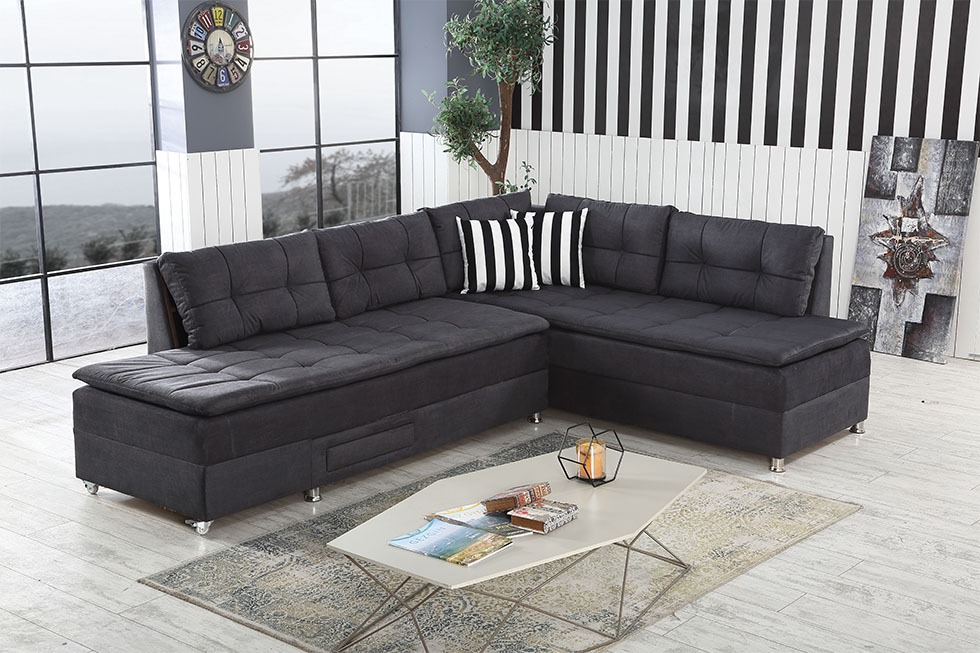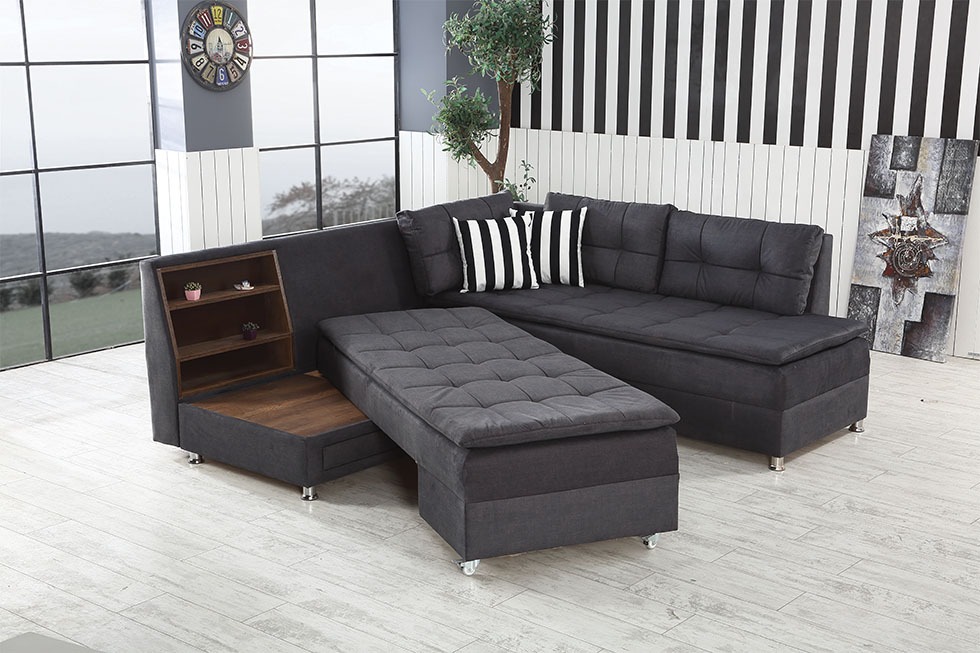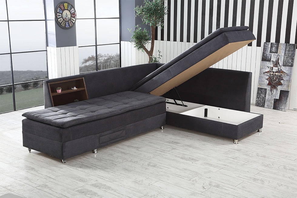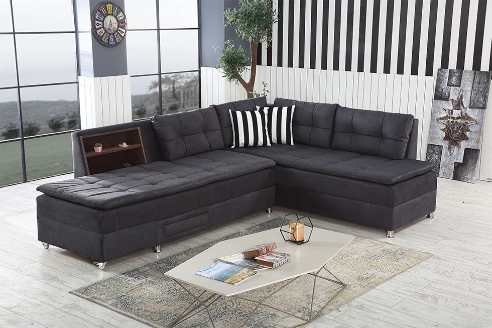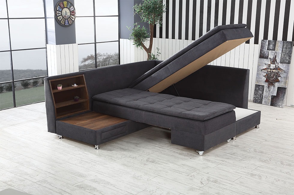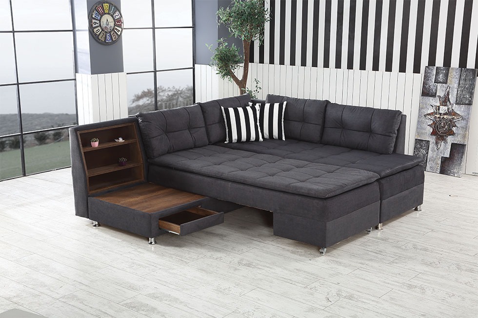 Boeno est un canapé d’angle mesurant 220cm par 300cm avec coffre et un coté rotatif permettant de transformer le canapé en lit.