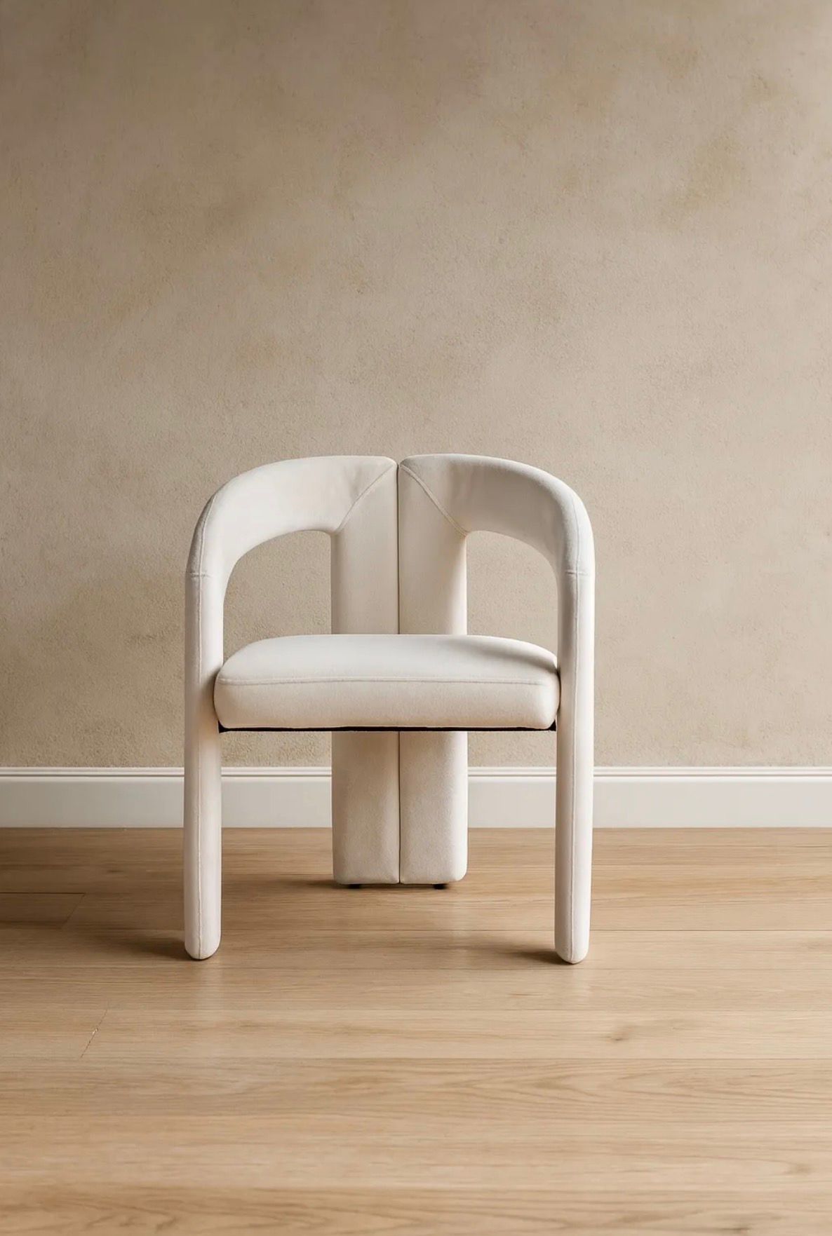 Chaise design en velours beige au style contemporain, avec lignes arrondies et accoudoirs intégrés. Son revêtement doux et son assise rembourrée offrent un excellent confort, tandis que sa forme sculpturale apporte une touche élégante et moderne à tout intérieur. Idéale pour salle à manger, bureau ou espace d’accueil.