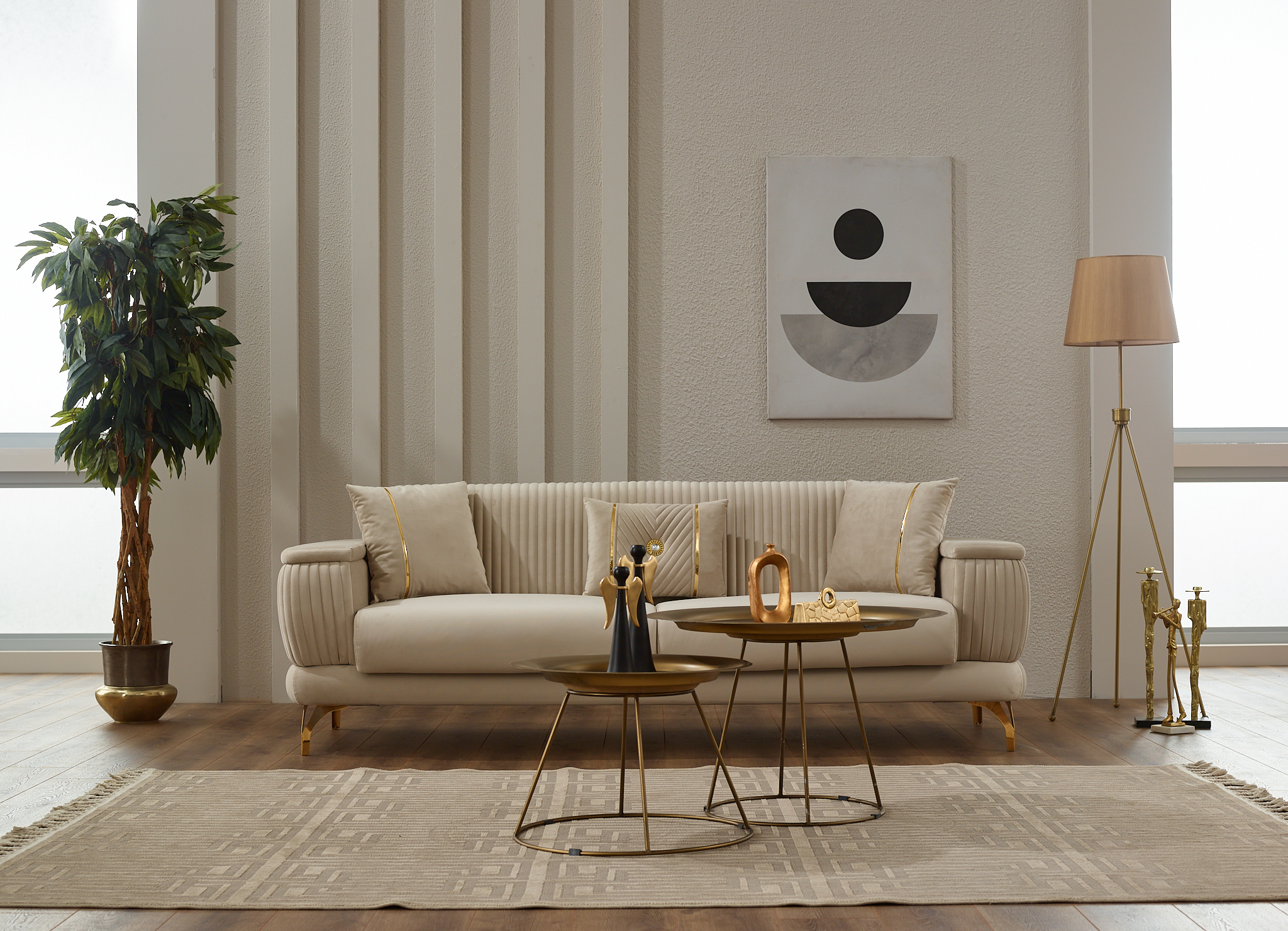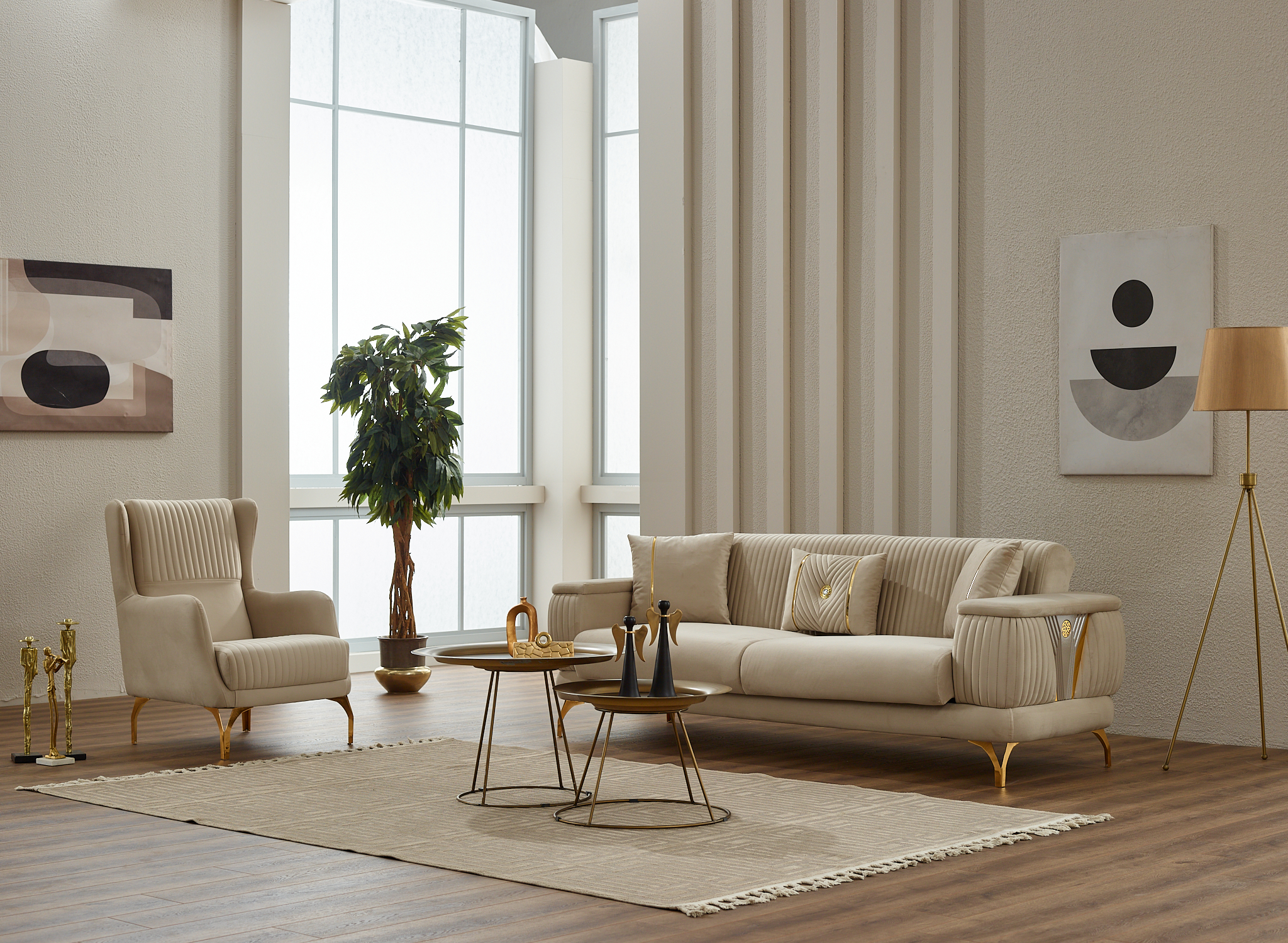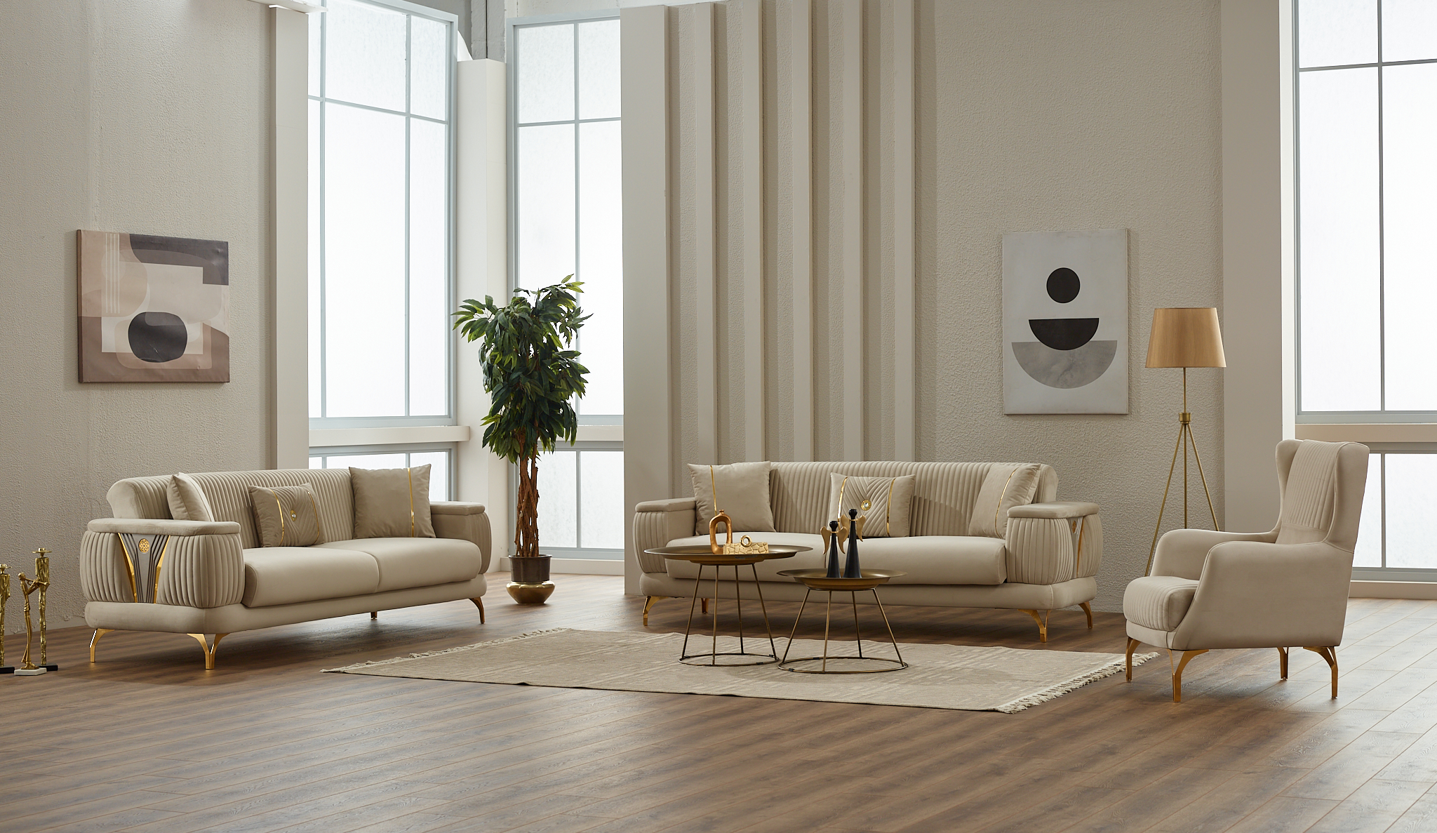 Sublimez votre intérieur avec cet ensemble de salon au design chic et raffiné, pensé pour créer une ambiance élégante et accueillante. Composé de deux canapés et d’un fauteuil assorti, il se distingue par ses lignes modernes, son revêtement clair lumineux et ses finitions dorées décoratives qui apportent une touche haut de gamme.