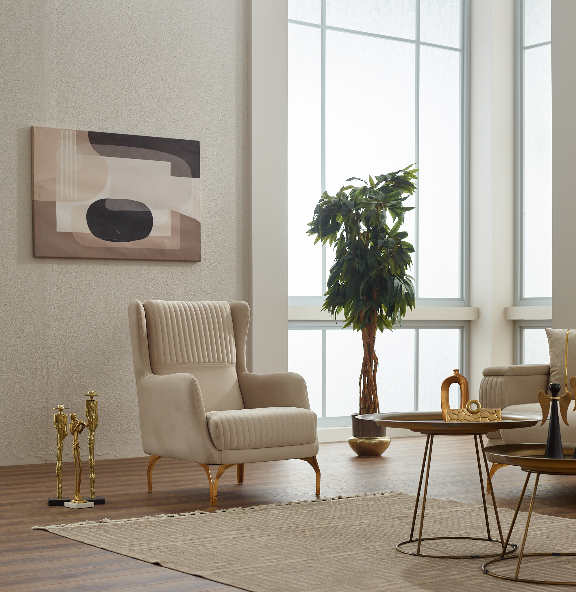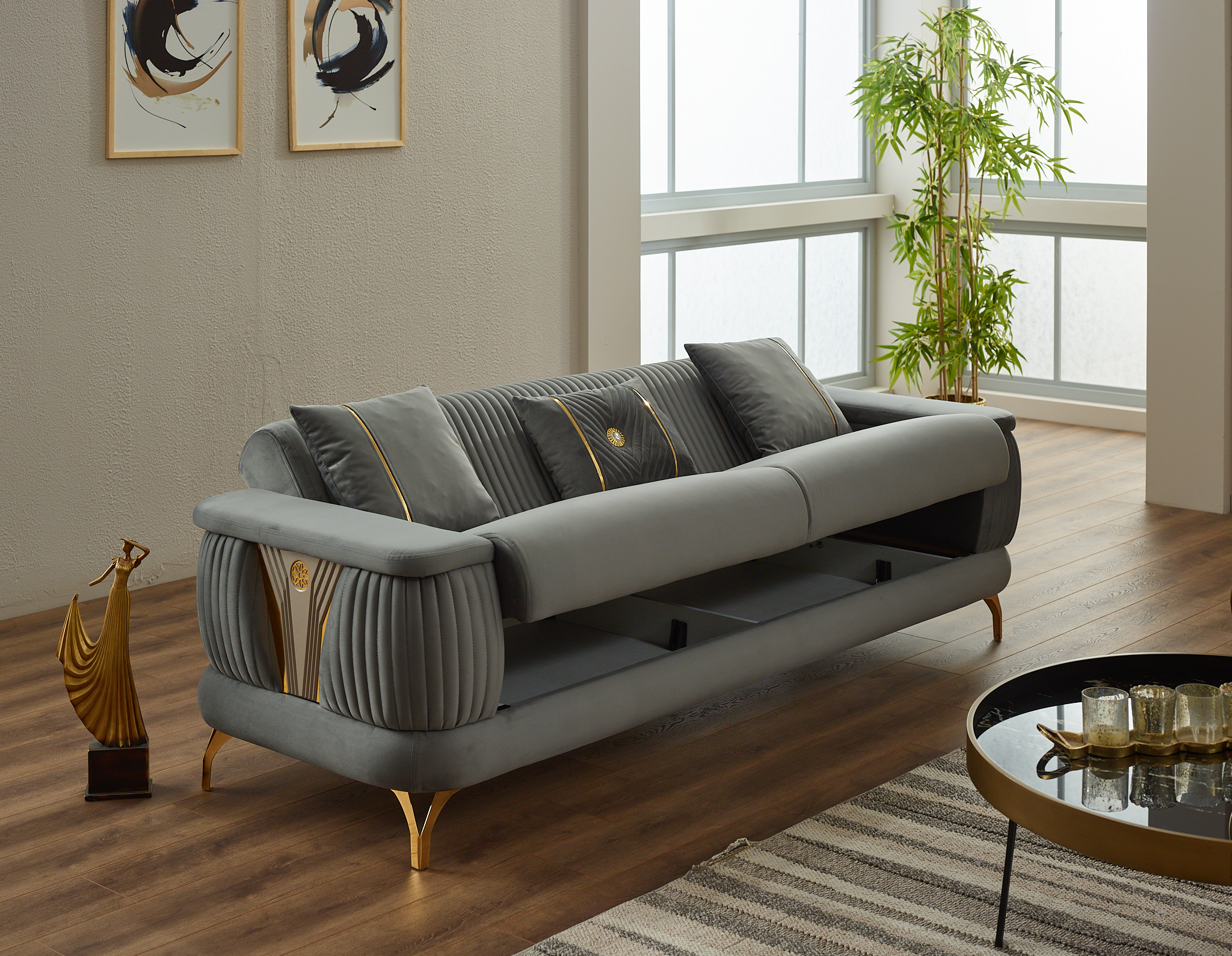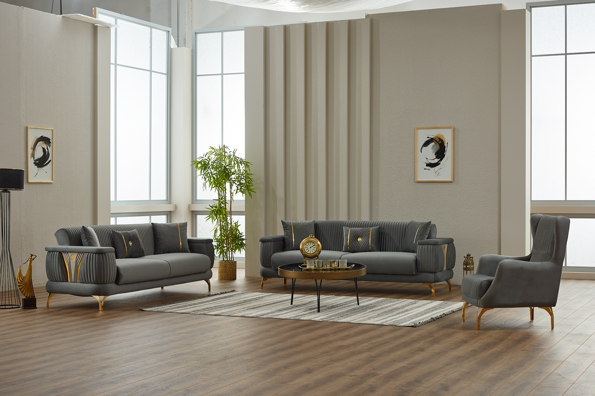 Les dossiers et accoudoirs finement structurés, les détails plissés verticaux et les inserts dorés confèrent à l’ensemble une forte identité visuelle. Les assises larges et le rembourrage haute densité garantissent un confort durable, idéal pour les moments de détente comme pour recevoir vos invités avec style.