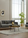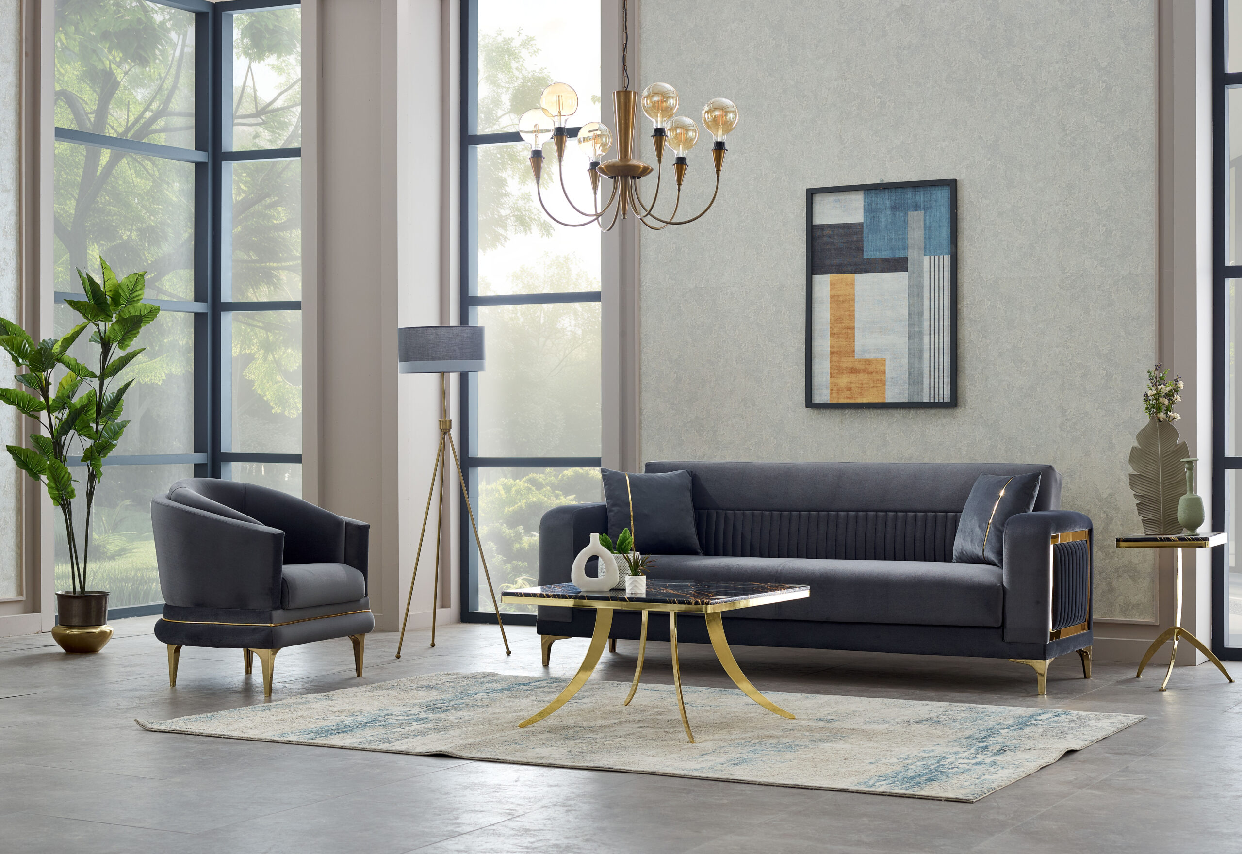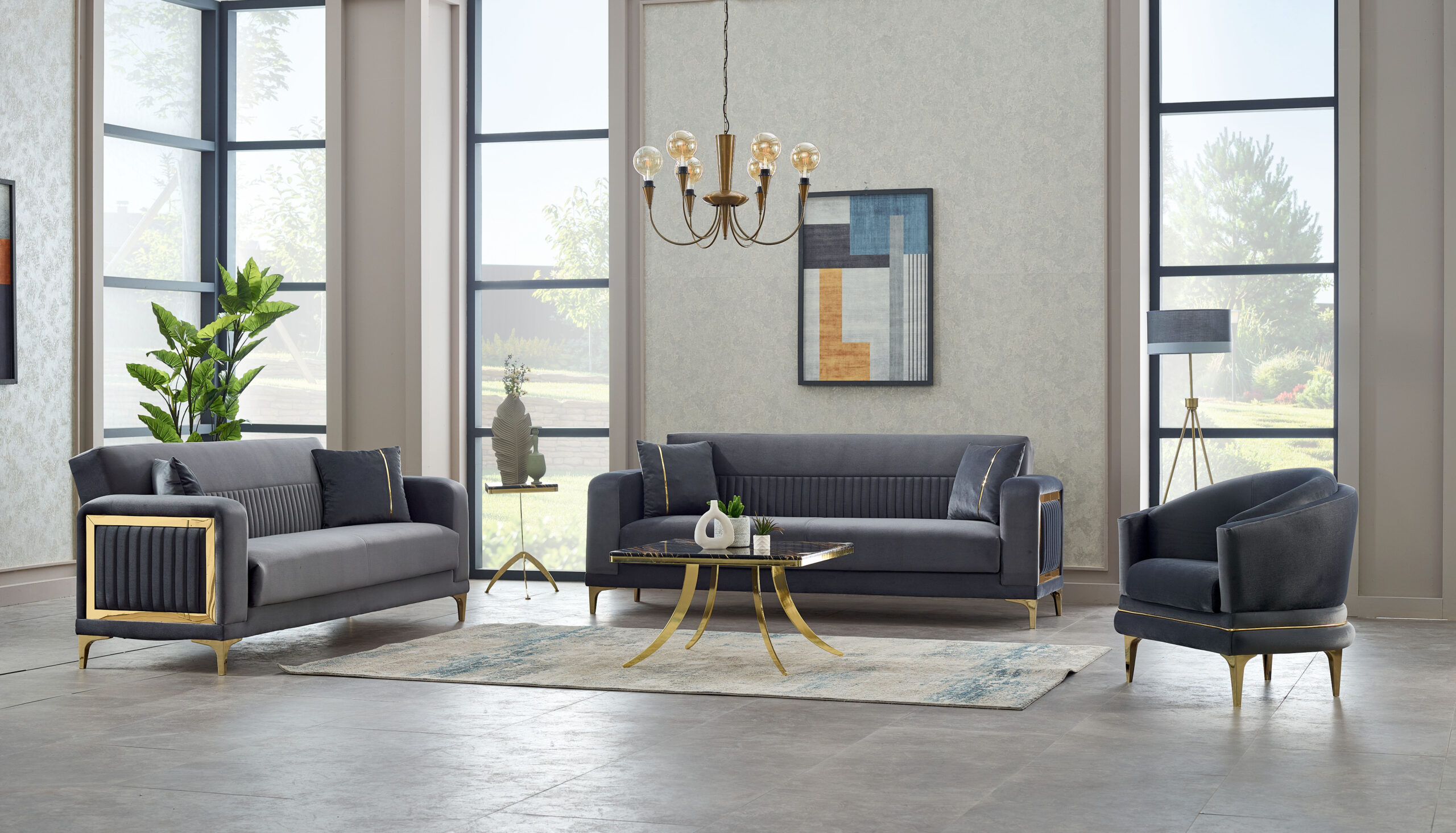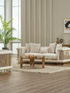 Le design se distingue par ses accoudoirs structurés avec inserts décoratifs, ses dossiers finement rainurés et ses pieds métalliques dorés qui élèvent visuellement l’ensemble. Les assises larges et le rembourrage haute densité garantissent un confort durable, parfait pour les moments de détente comme pour recevoir avec élégance.