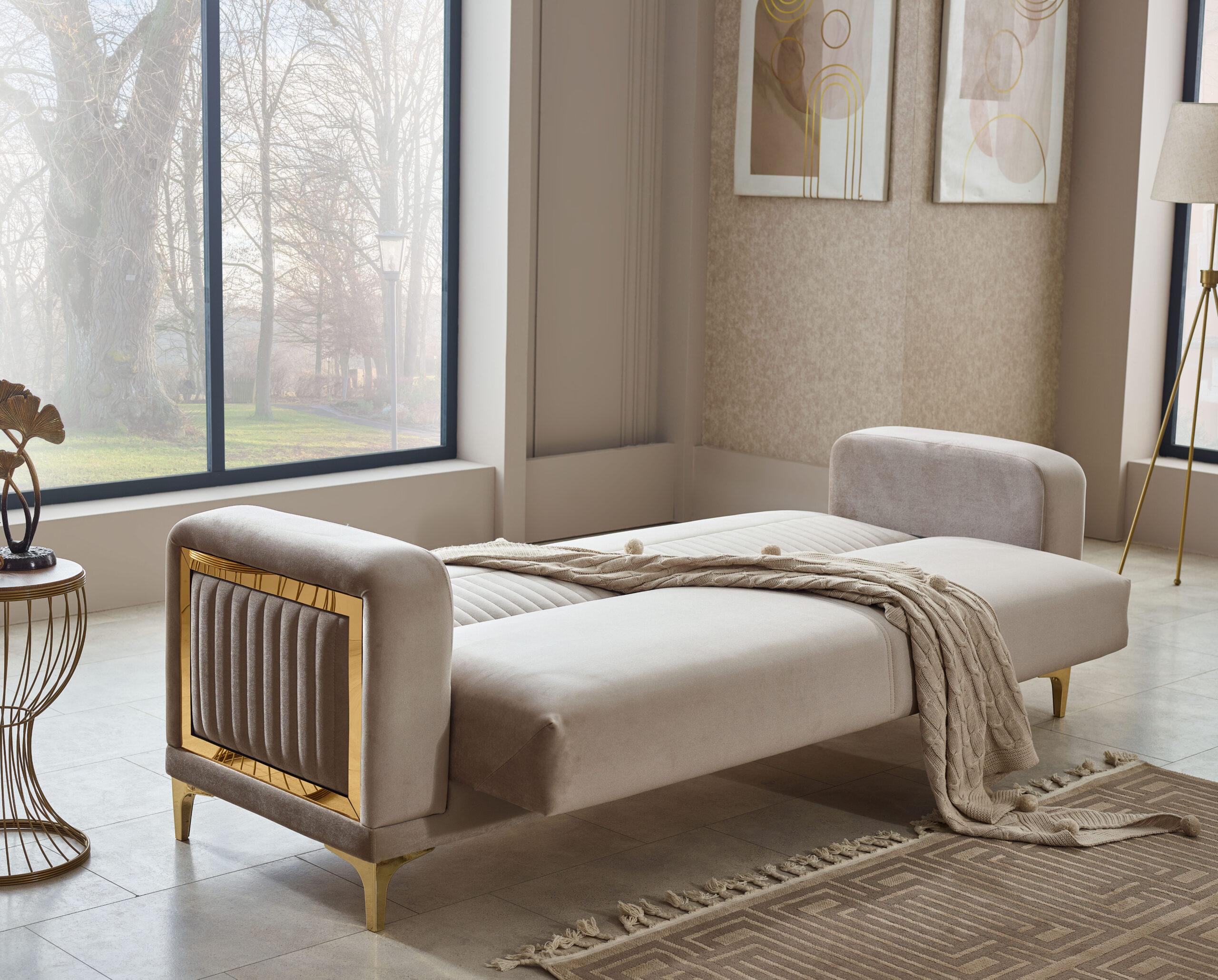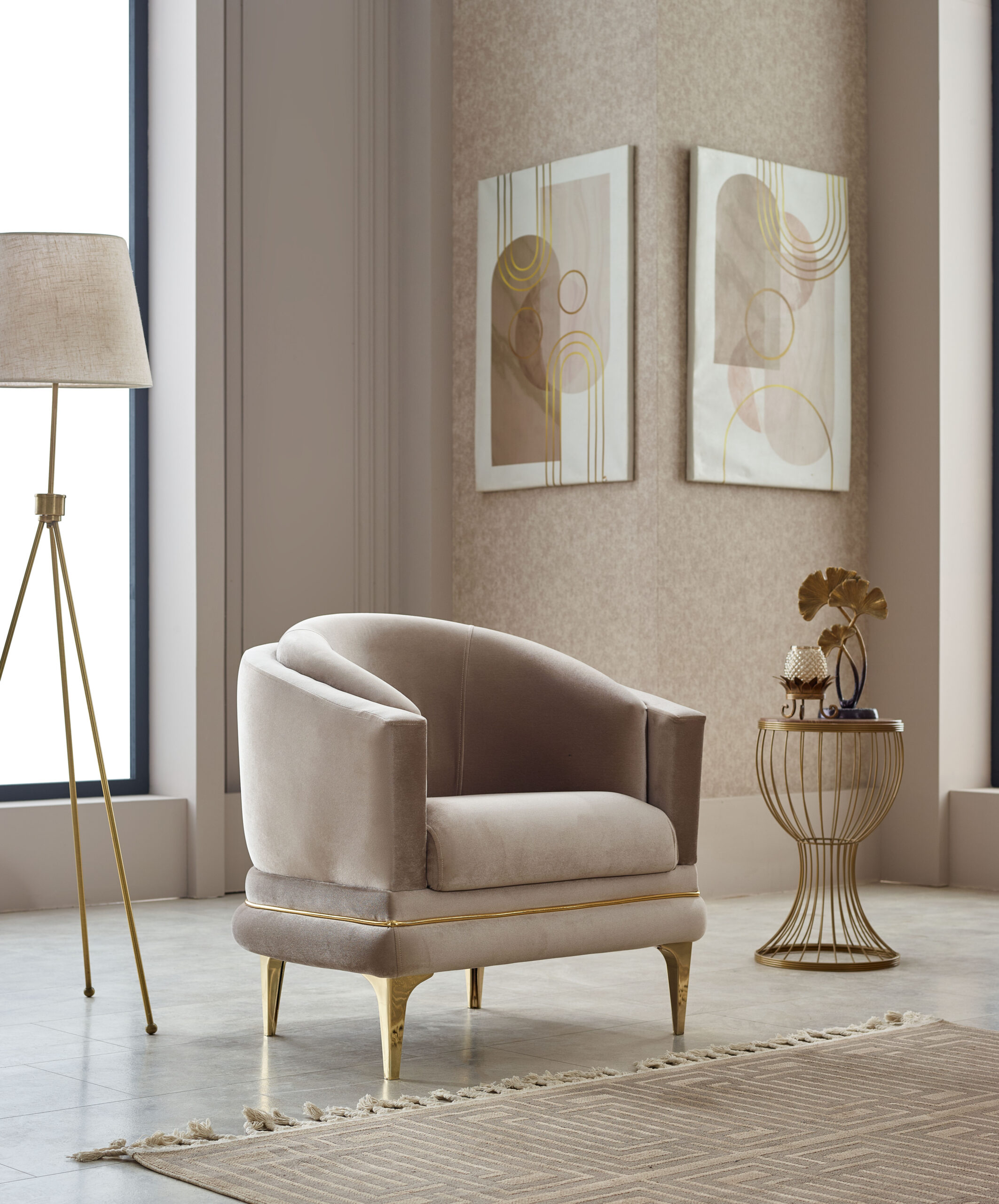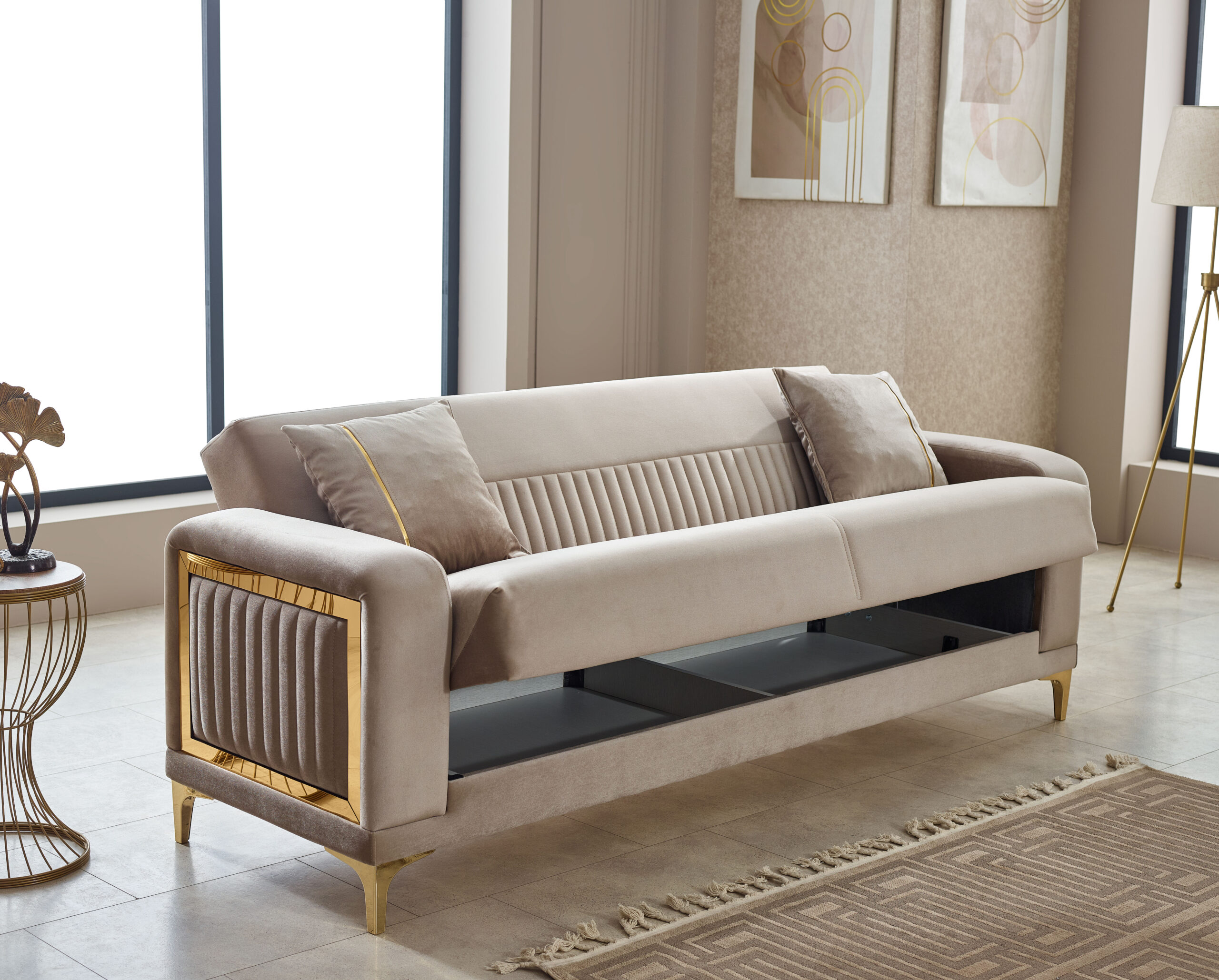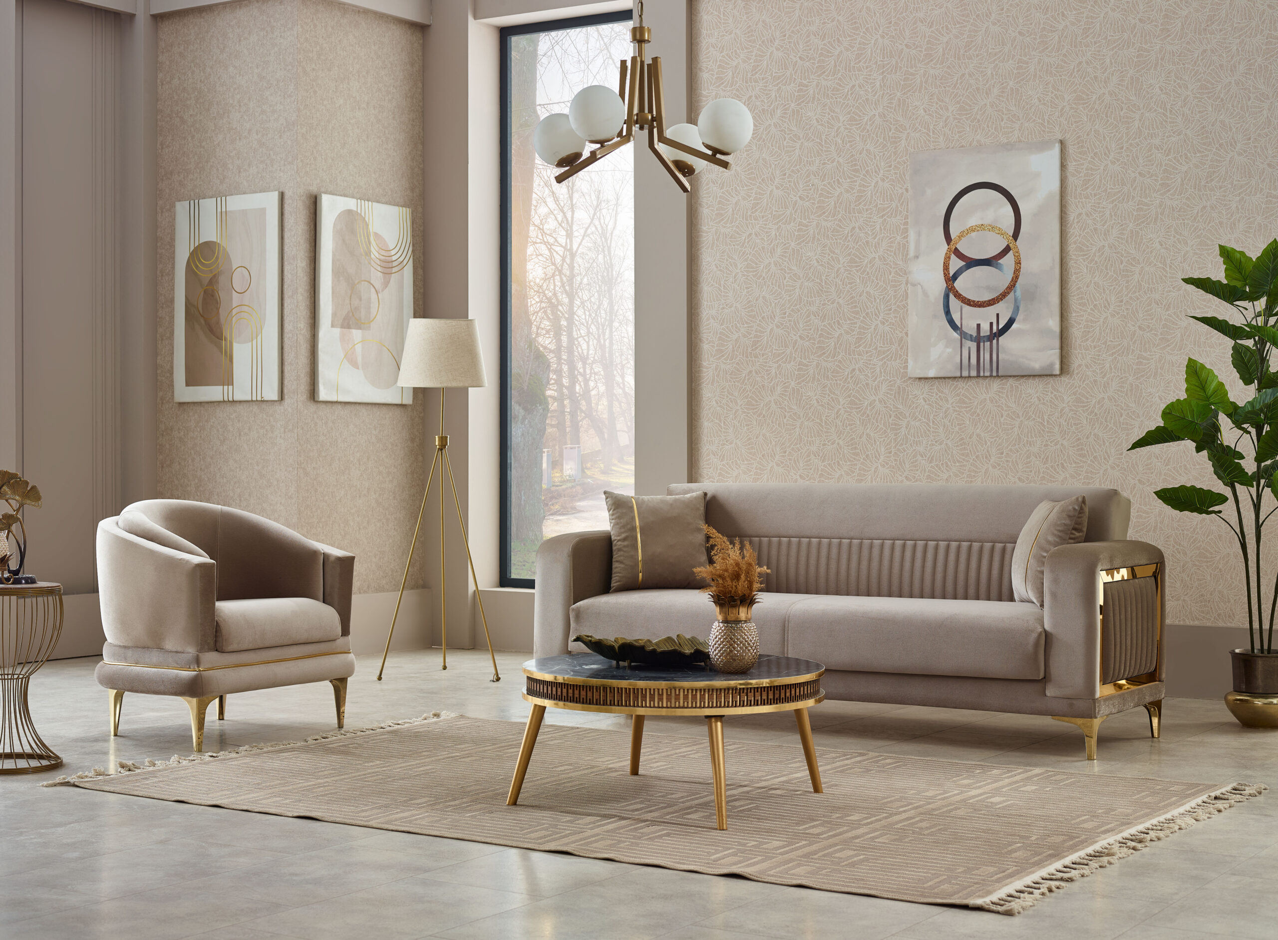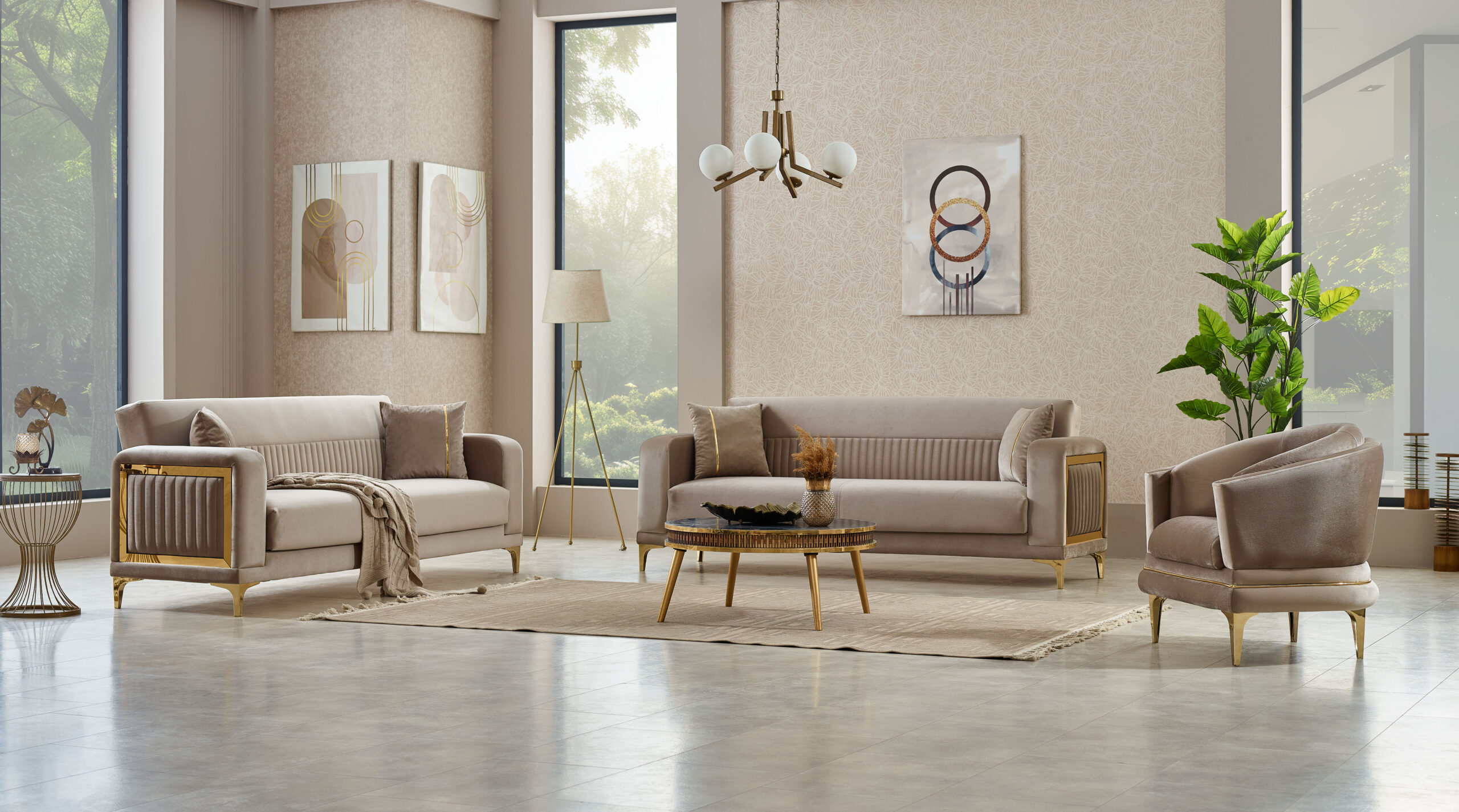 Ensemble salon contemporain beige & or – élégance premium et confort supérieur
