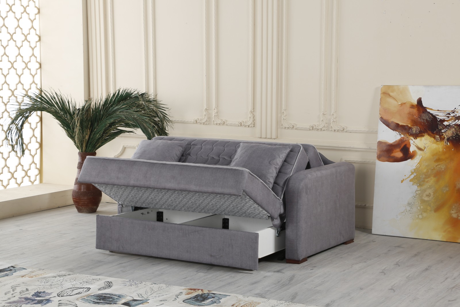 Grâce à son mécanisme d’ouverture facile, le canapé se transforme rapidement en couchage confortable. Son grand coffre dissimulé permet de ranger couvertures, oreillers ou linge de maison, pour un salon toujours bien organisé. Son revêtement gris contemporain, doux au toucher, s’intègre facilement dans tous les styles d’intérieur.