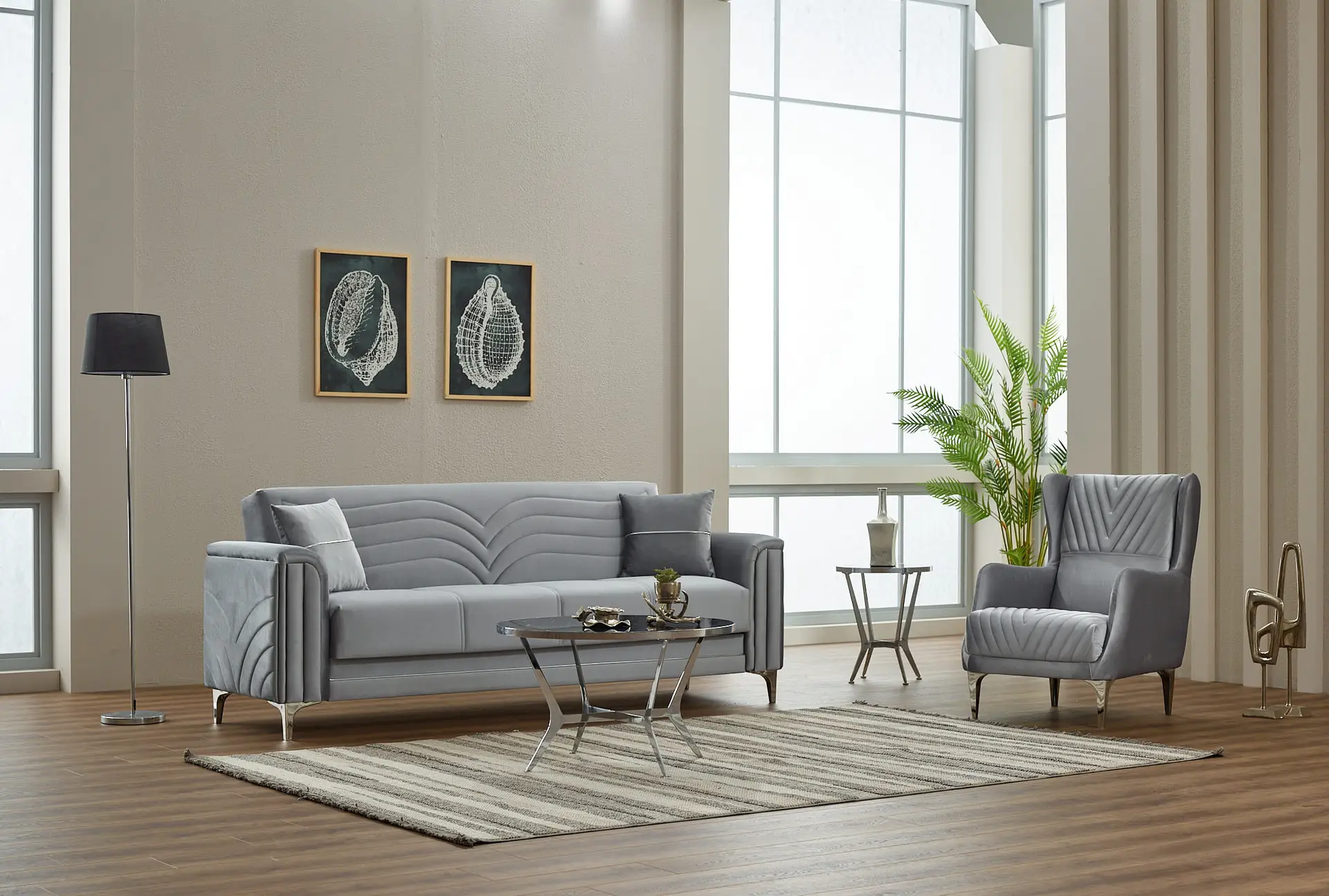 Apportez élégance et modernité à votre salon avec cet ensemble de canapés au design contemporain, pensé pour offrir un parfait équilibre entre style et confort. Son revêtement gris raffiné, ses lignes courbes matelassées et ses finitions soignées créent une ambiance chic et apaisante, idéale pour les intérieurs modernes.