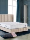 La structure tapissée, aux lignes nettes et harmonieuses, repose sur un piètement discret qui allège l’ensemble et met en valeur le volume du couchage. Le matelas épais, généreusement capitonné, est conçu pour offrir un accueil confortable et un soutien équilibré, favorisant un sommeil profond et réparateur.