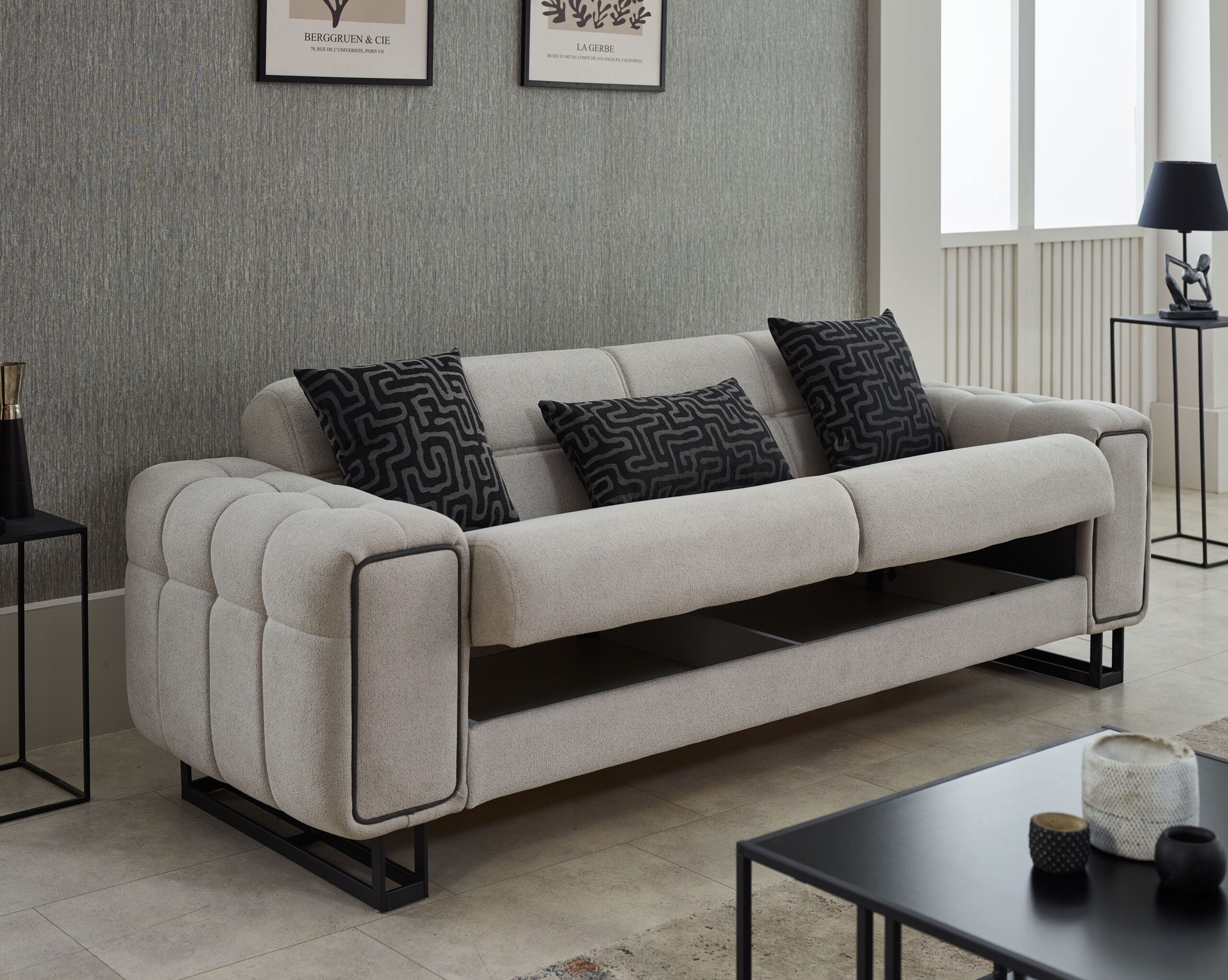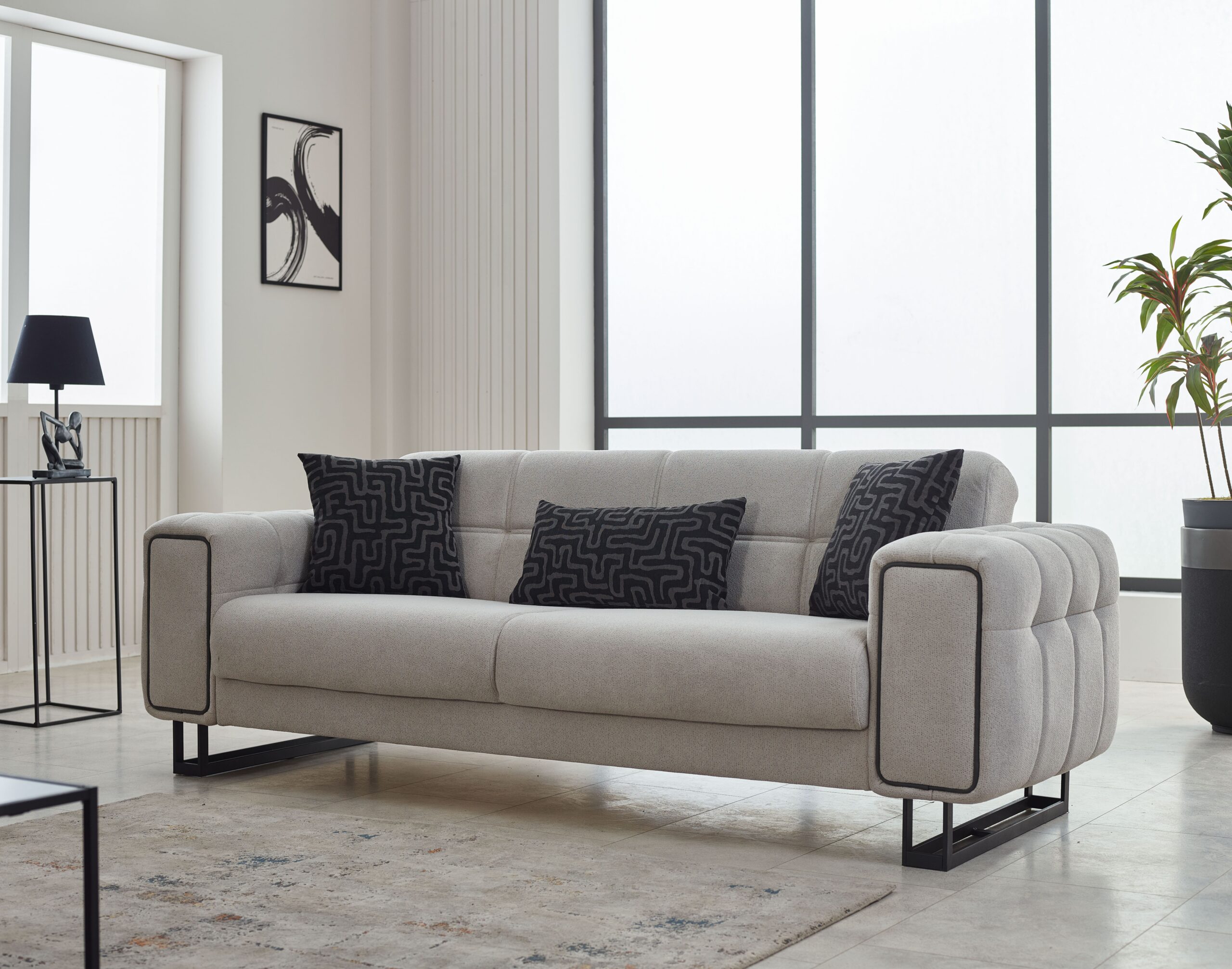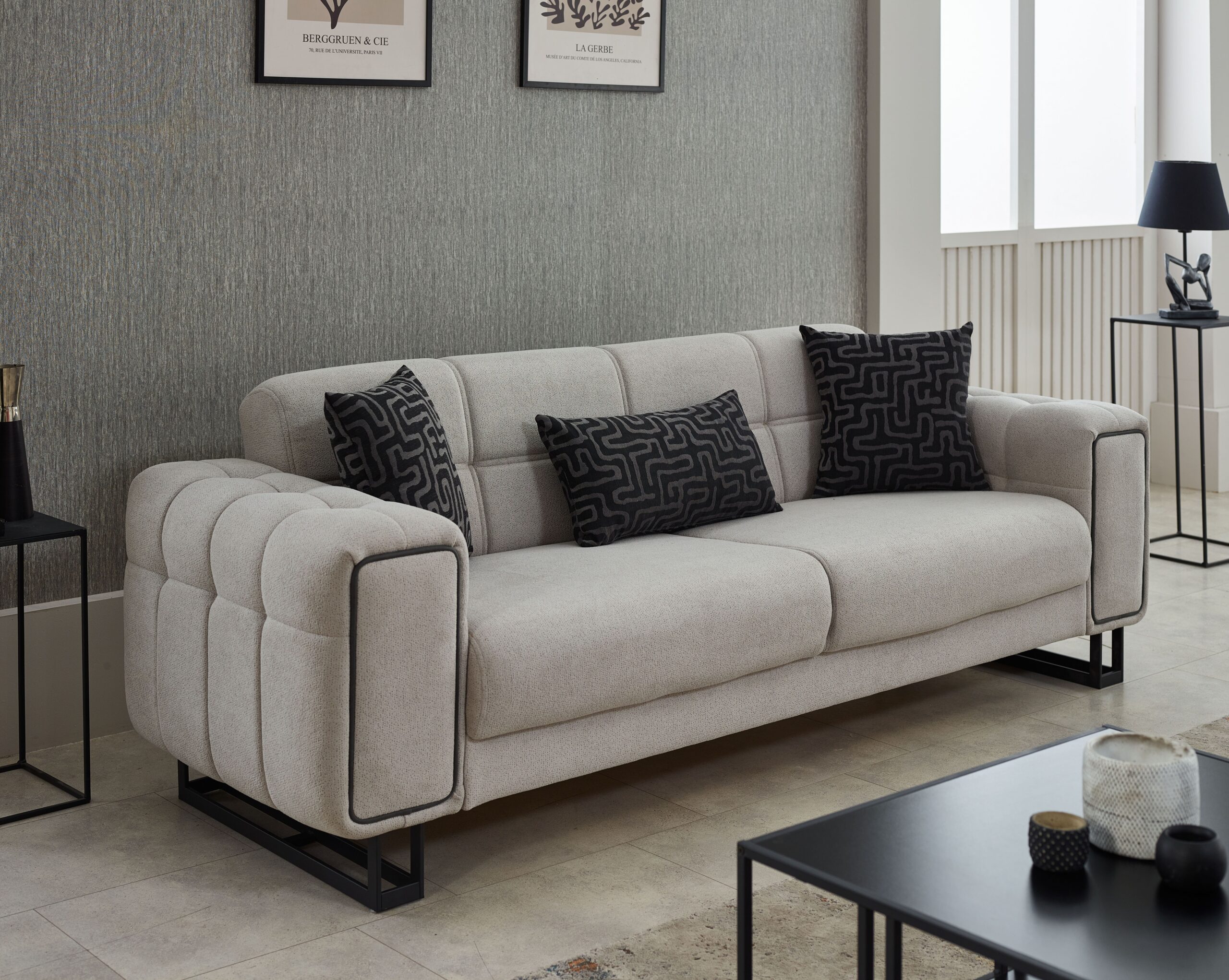 Offrez à votre salon une allure moderne et sophistiquée avec cet ensemble de salon au design contemporain, alliant élégance minimaliste et confort supérieur. Avec ses lignes droites, ses finitions soignées et son contraste subtil entre le tissu clair et les pieds noirs, ce modèle s’intègre parfaitement dans les intérieurs actuels, urbains ou épurés.