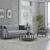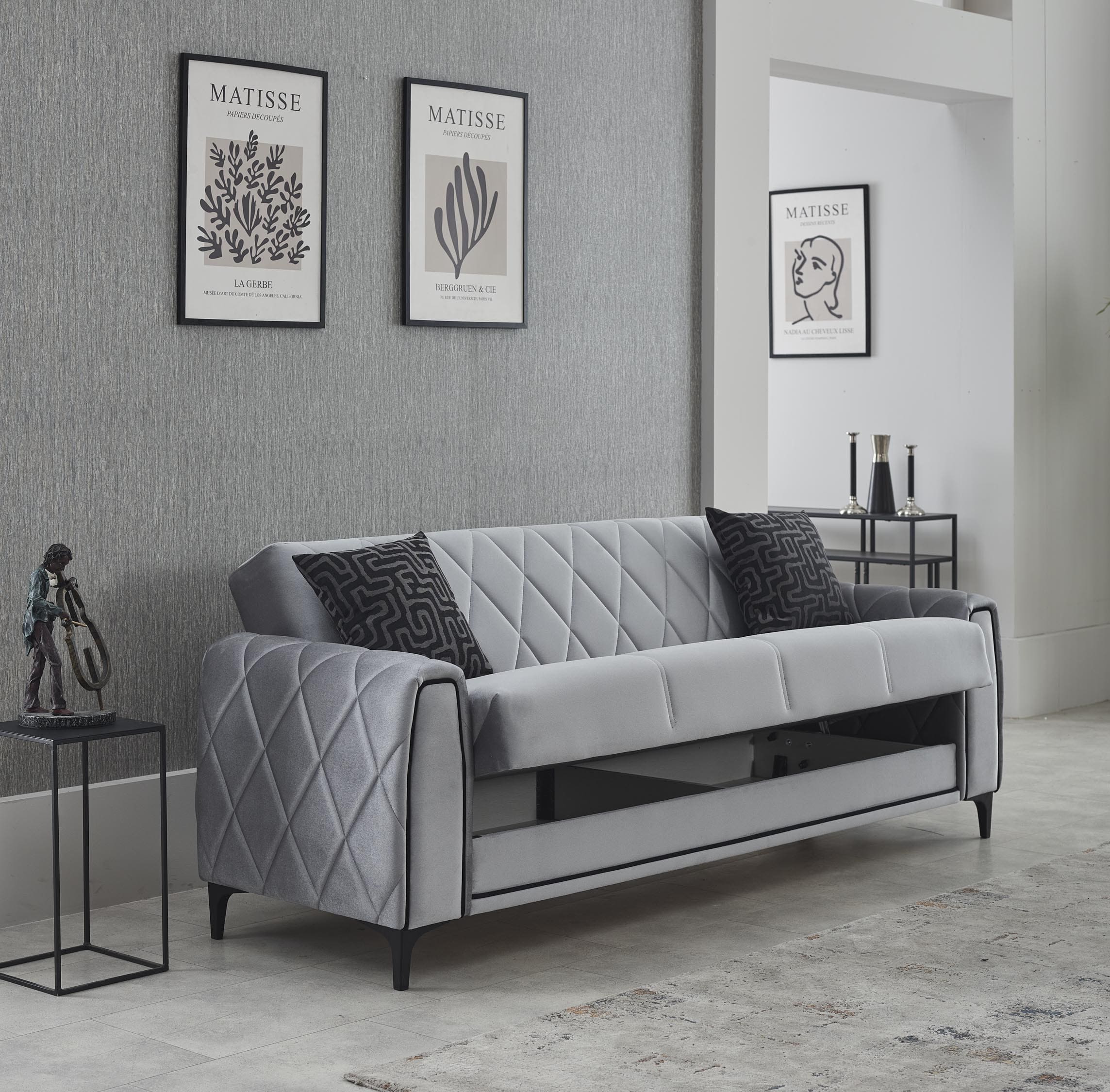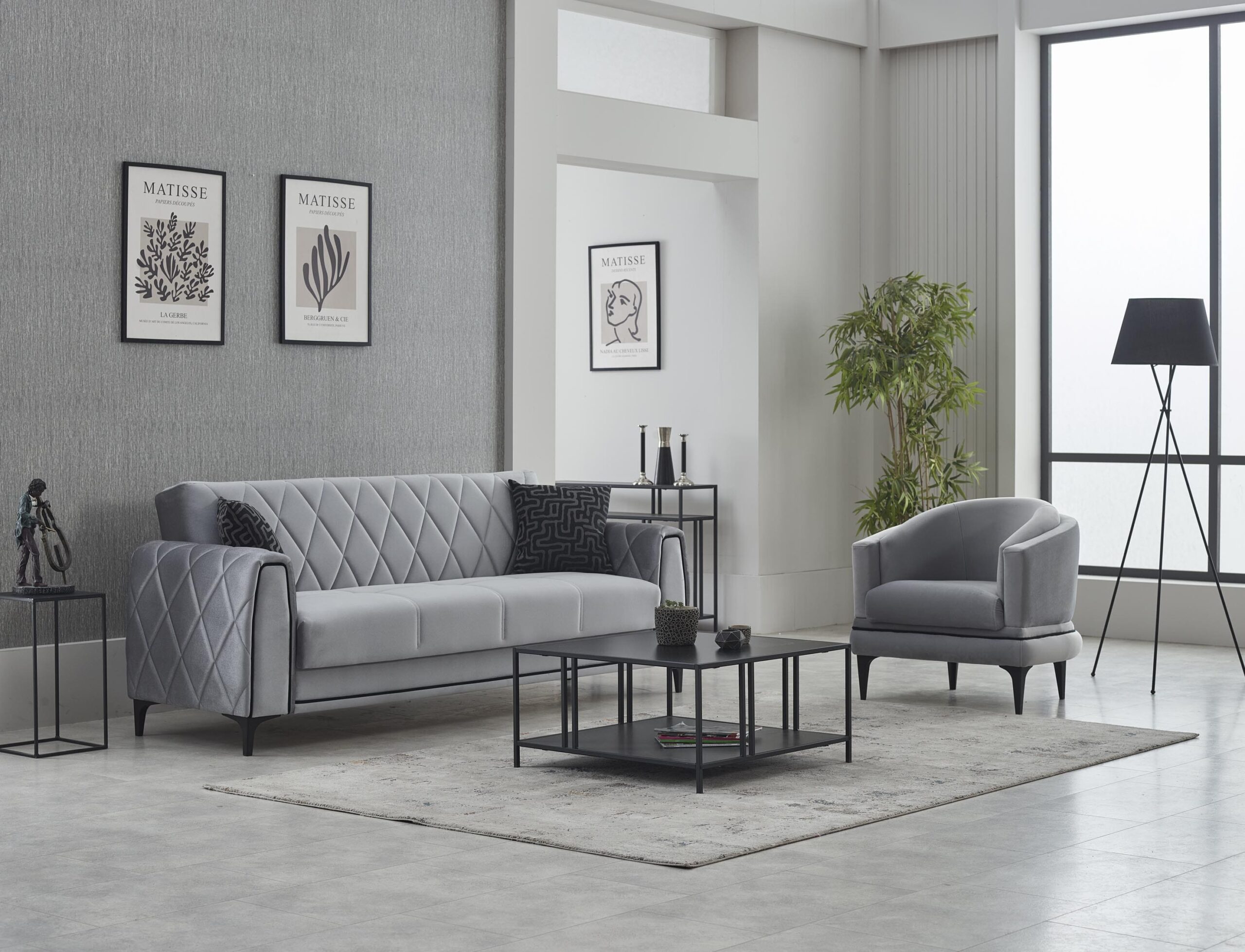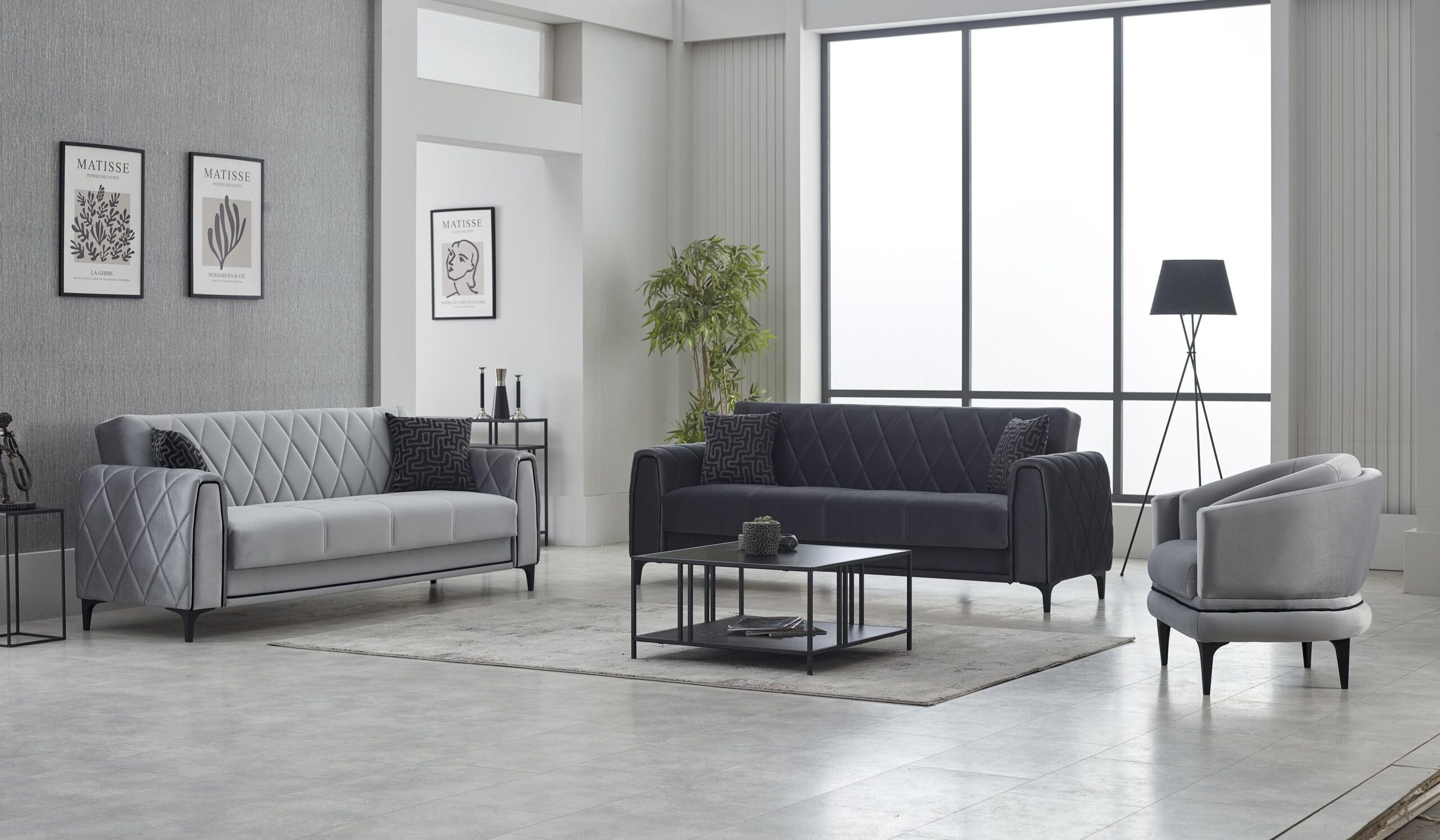 Le contraste harmonieux des teintes gris clair et gris foncé crée une composition visuelle raffinée, tandis que les surpiqûres géométriques sur les dossiers et accoudoirs ajoutent une touche design distinctive. Les pieds fins en métal noir renforcent l’allure moderne tout en assurant stabilité et durabilité.