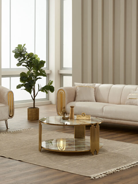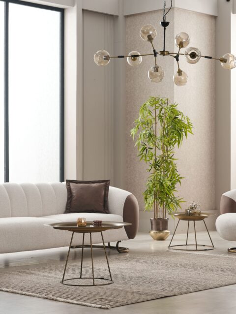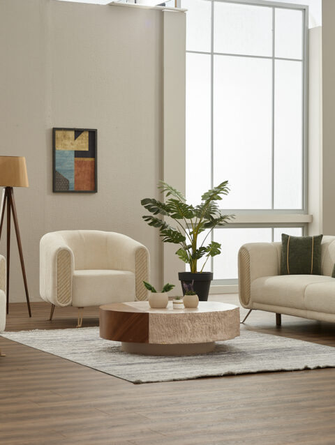 Composé de canapés aux volumes arrondis et d’un fauteuil assorti, cet ensemble séduit par son look sculptural et son confort exceptionnel. Le contraste élégant entre le tissu clair et la finition chaleureuse du canapé brun crée un effet visuel raffiné, parfait pour les salons contemporains et design.