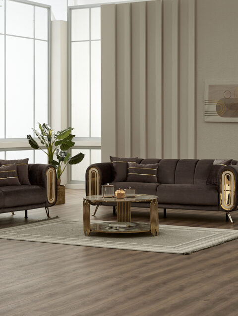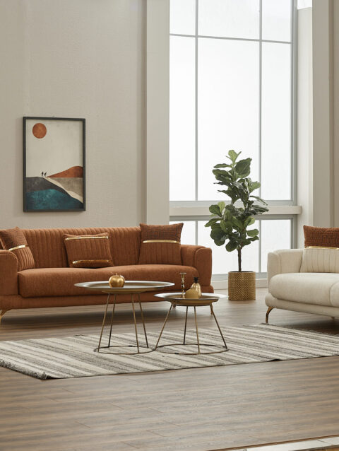 Composé de canapés aux volumes arrondis et d’un fauteuil assorti, cet ensemble séduit par son look sculptural et son confort exceptionnel. Le contraste élégant entre le tissu clair et la finition chaleureuse du canapé brun crée un effet visuel raffiné, parfait pour les salons contemporains et design.