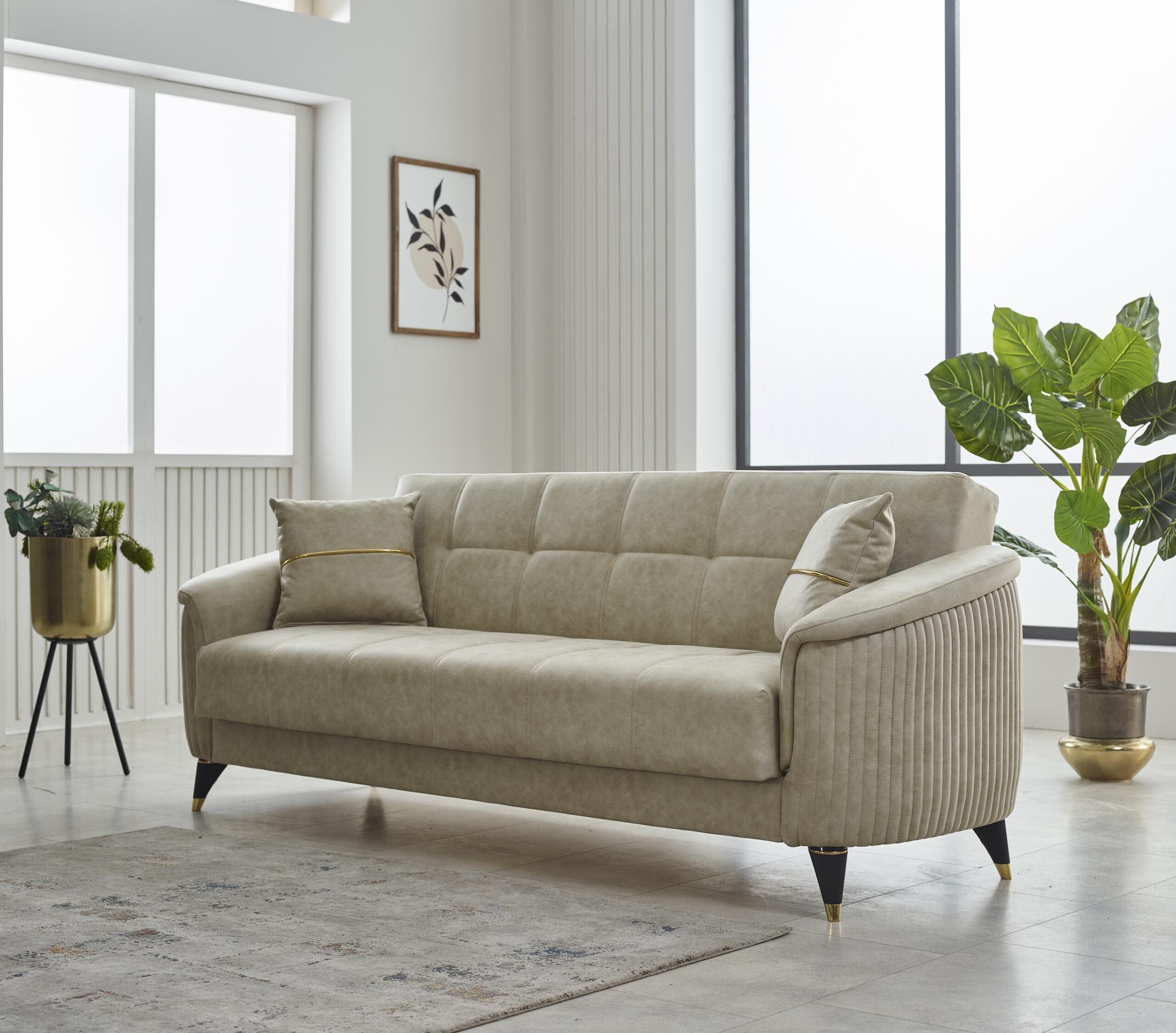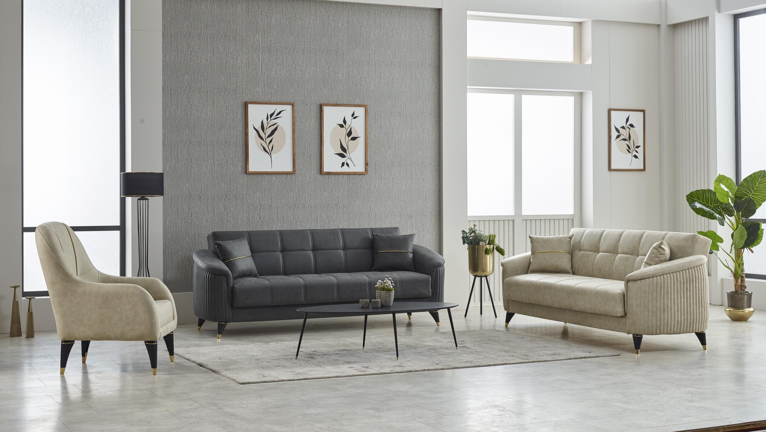 Composé de deux canapés et d’un fauteuil assorti, cet ensemble séduit par ses lignes douces, ses accoudoirs subtilement arrondis et ses détails verticaux texturés qui apportent du caractère. Les coussins décoratifs coordonnés et les pieds fuselés avec embouts dorés ajoutent une touche sophistiquée et tendance.