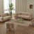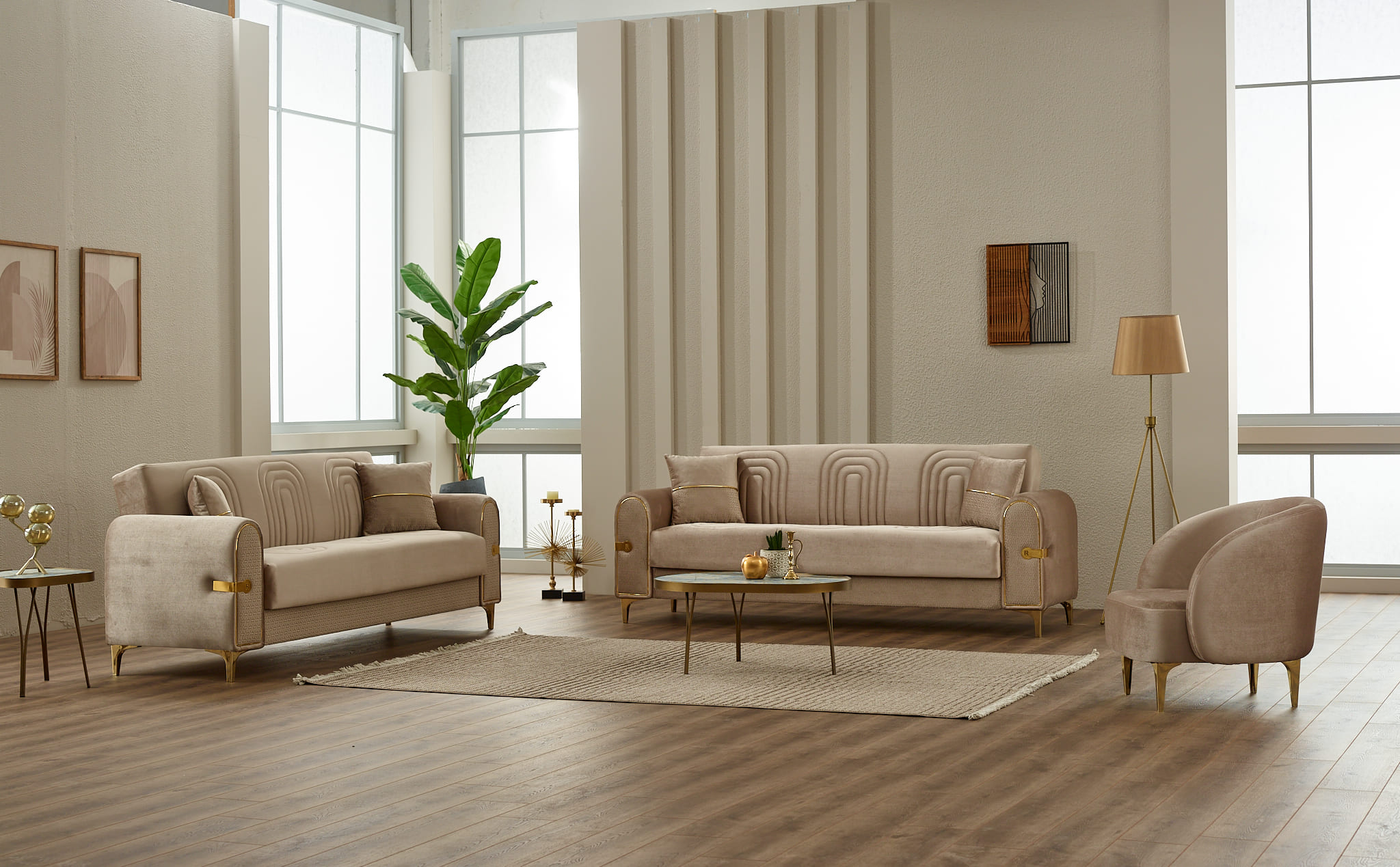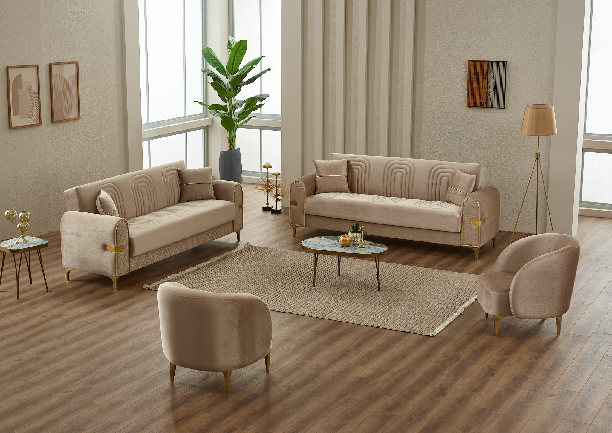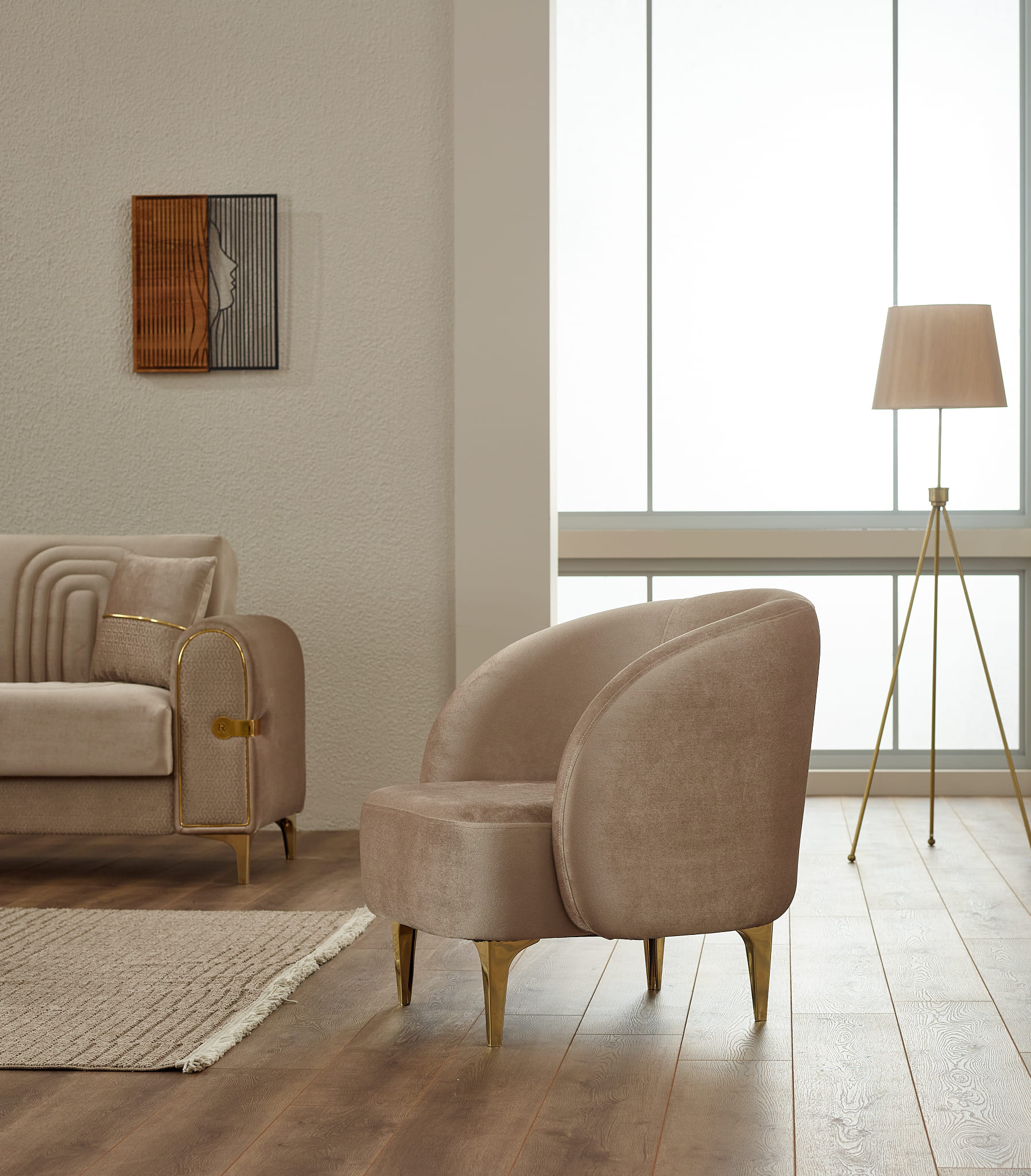 Les dossiers sont sublimés par un motif matelassé graphique qui donne du relief et une identité unique à l’ensemble. Le revêtement en tissu doux, dans un ton beige chaleureux, crée une ambiance lumineuse et accueillante. Les finitions dorées sur les accoudoirs et les pieds ajoutent une note luxueuse et moderne.