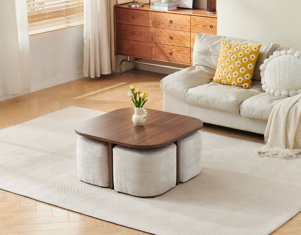 Table basse Marbella noyer MDF avec poufs 80cm