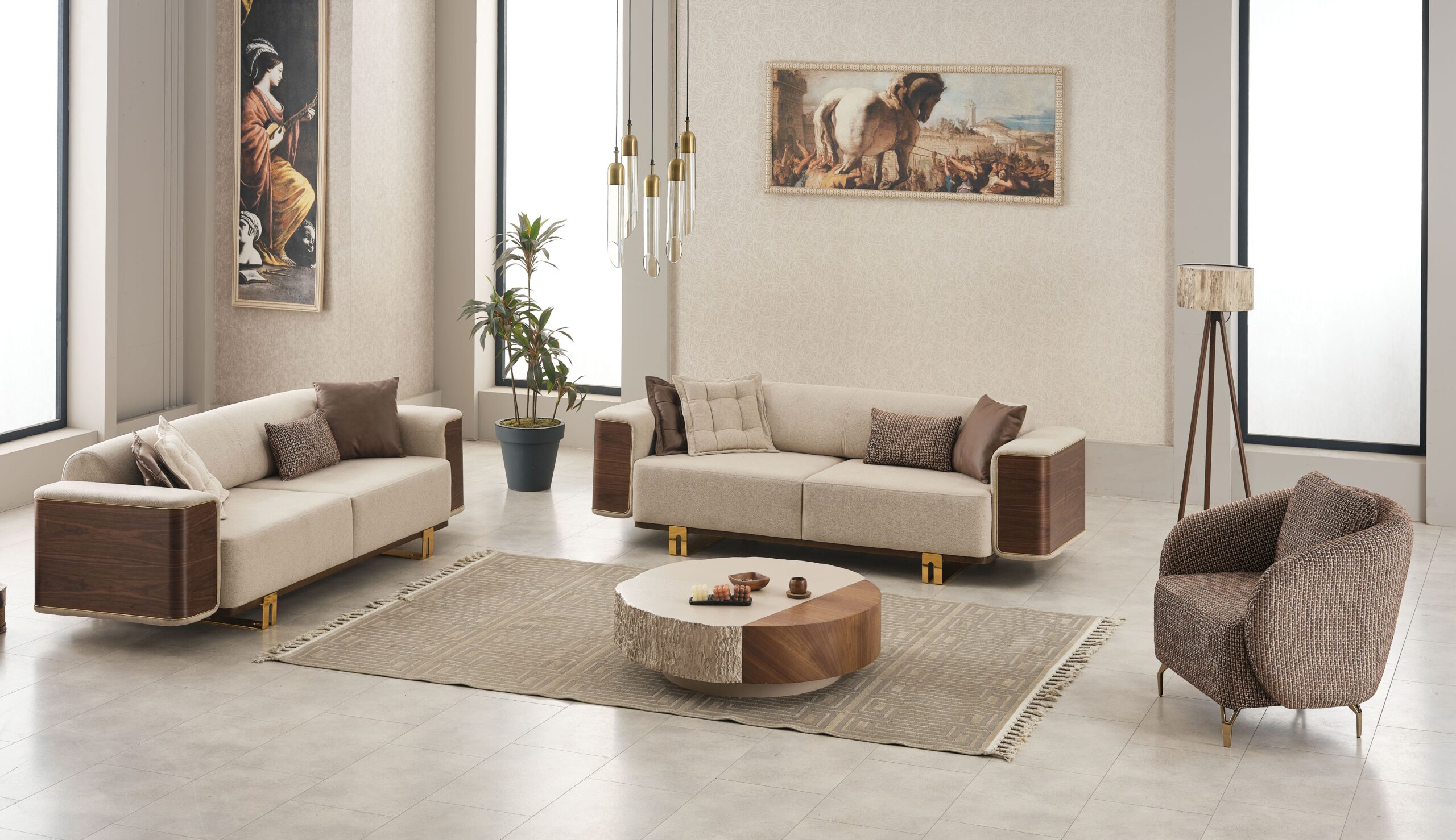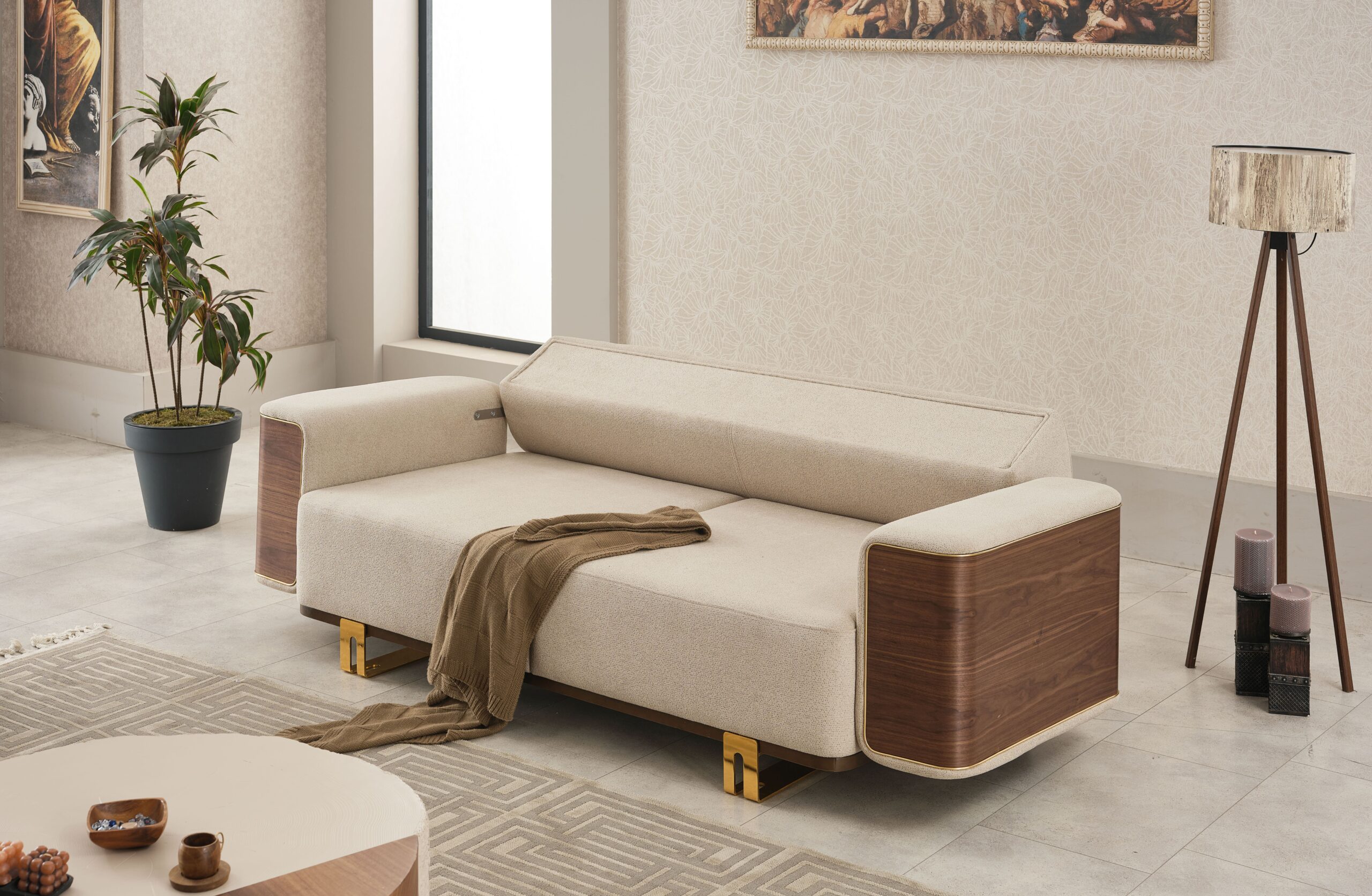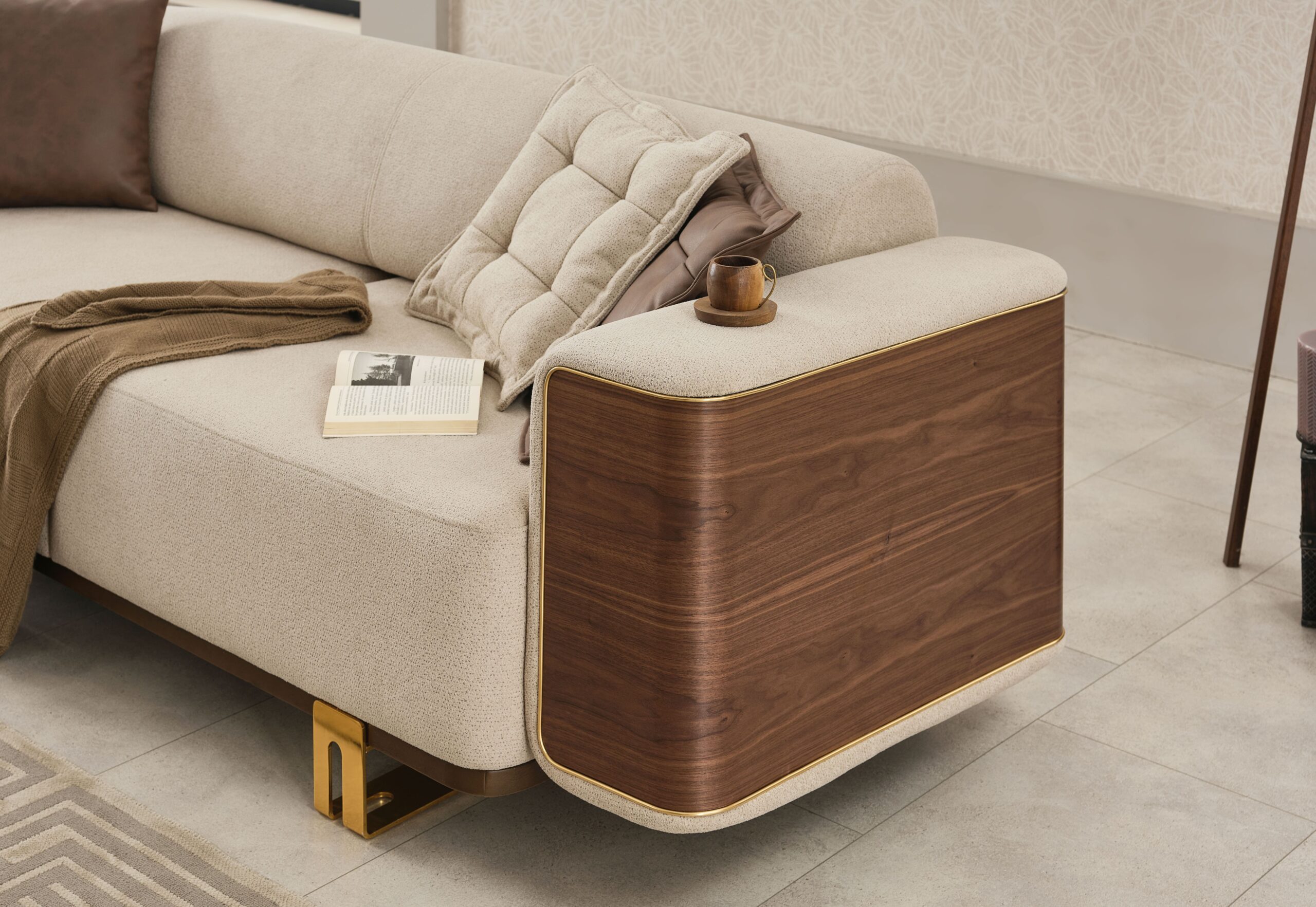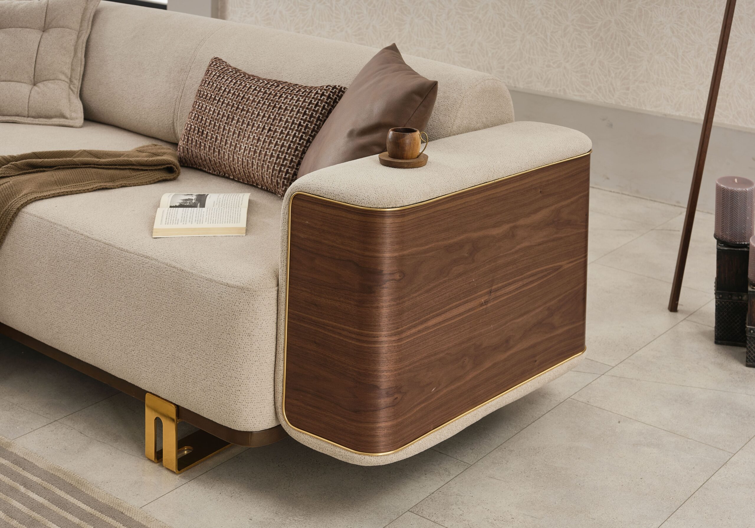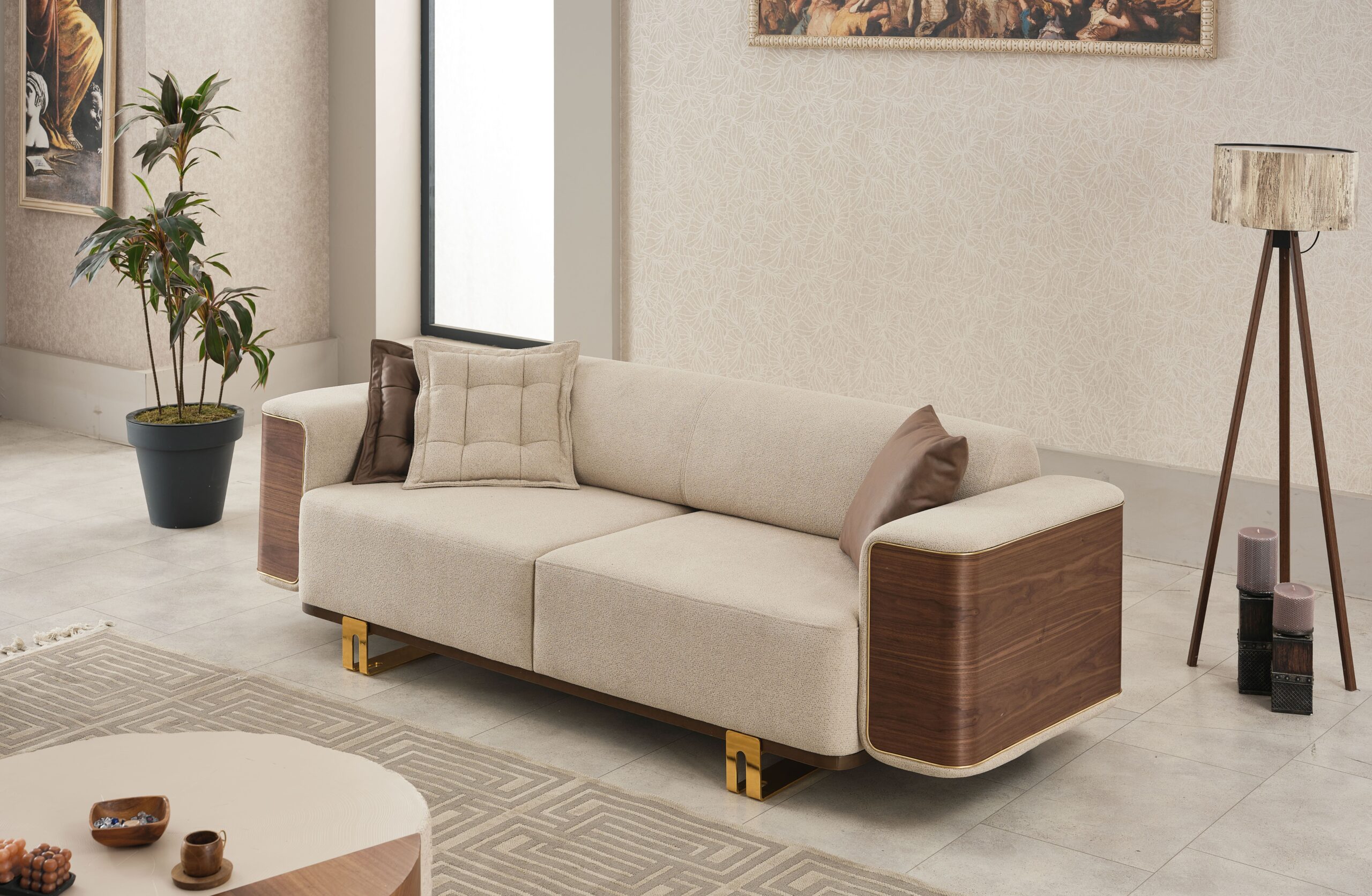 Apportez une ambiance chaleureuse et sophistiquée à votre intérieur avec cet ensemble de salon contemporain alliant tissu beige raffiné, finitions effet bois et détails métalliques dorés. Un design haut de gamme qui marie modernité et esprit naturel pour un rendu visuel très élégant.
