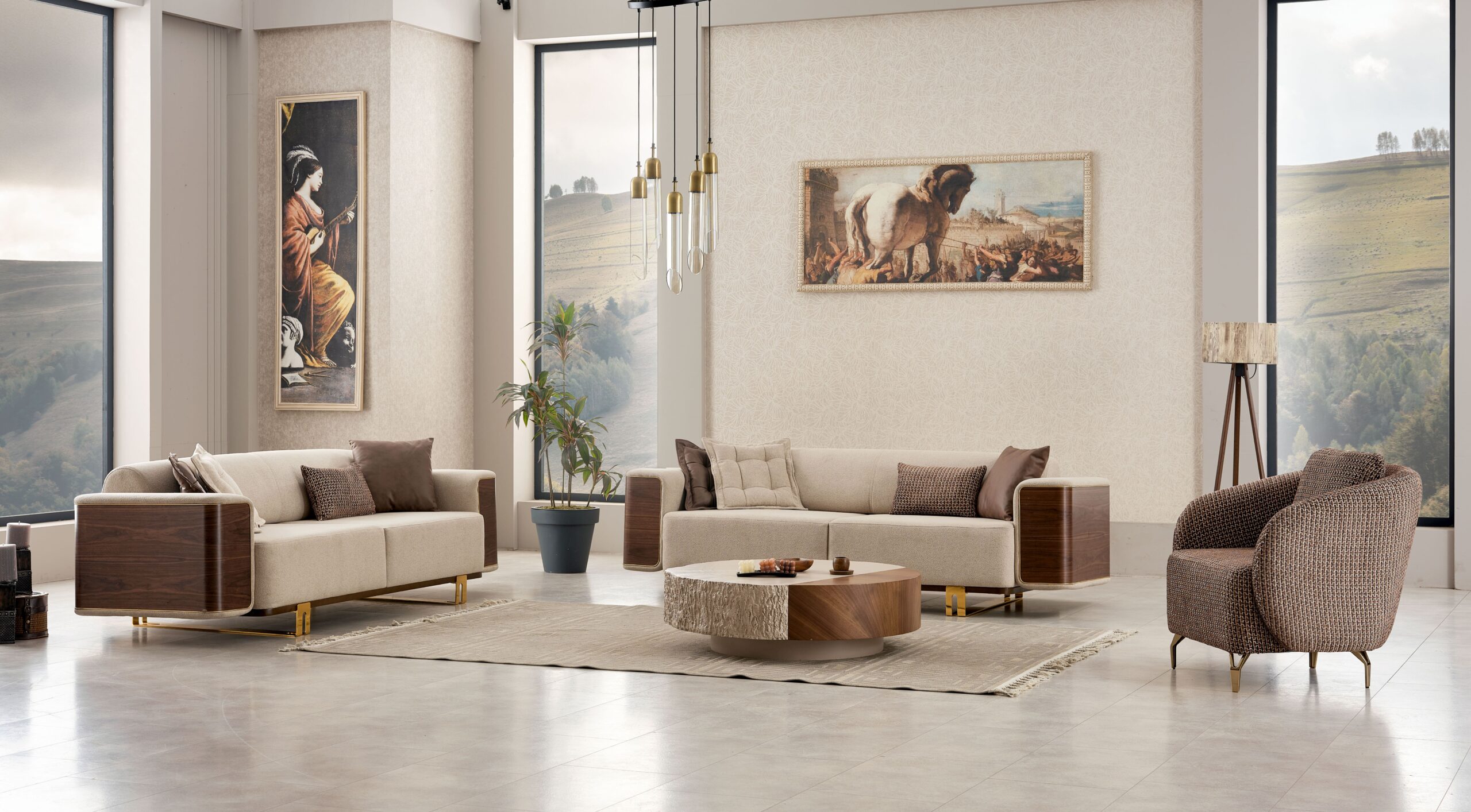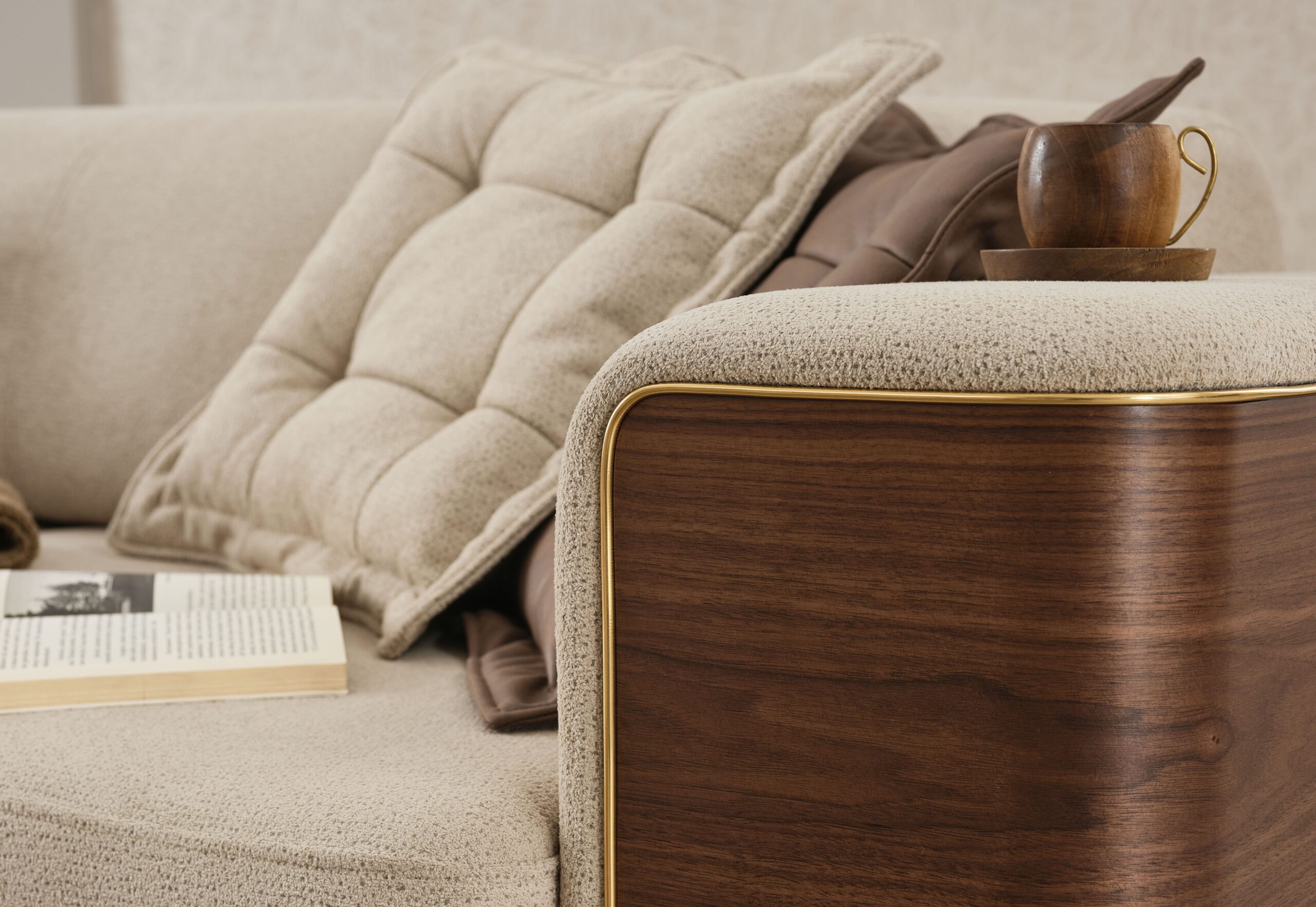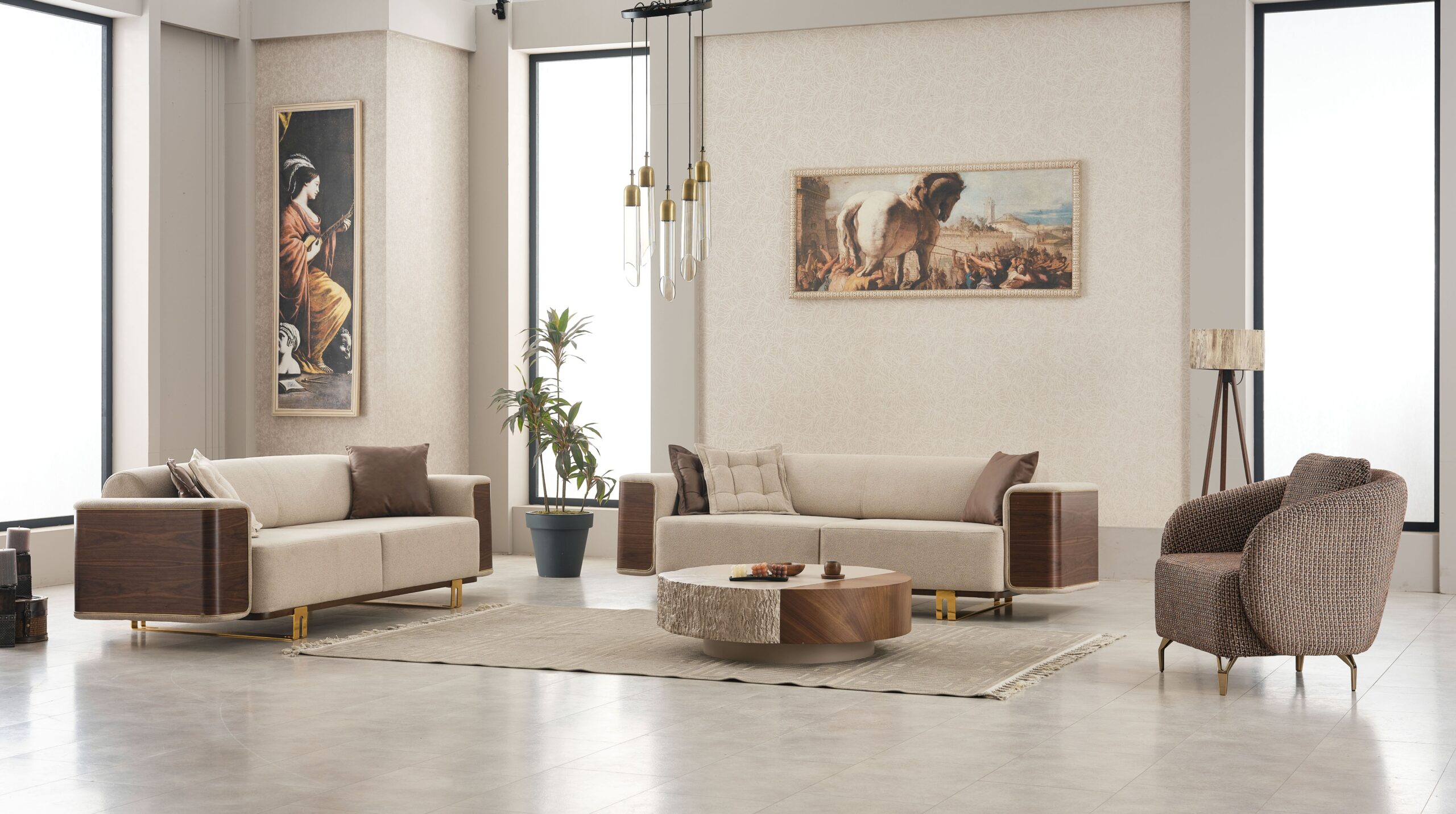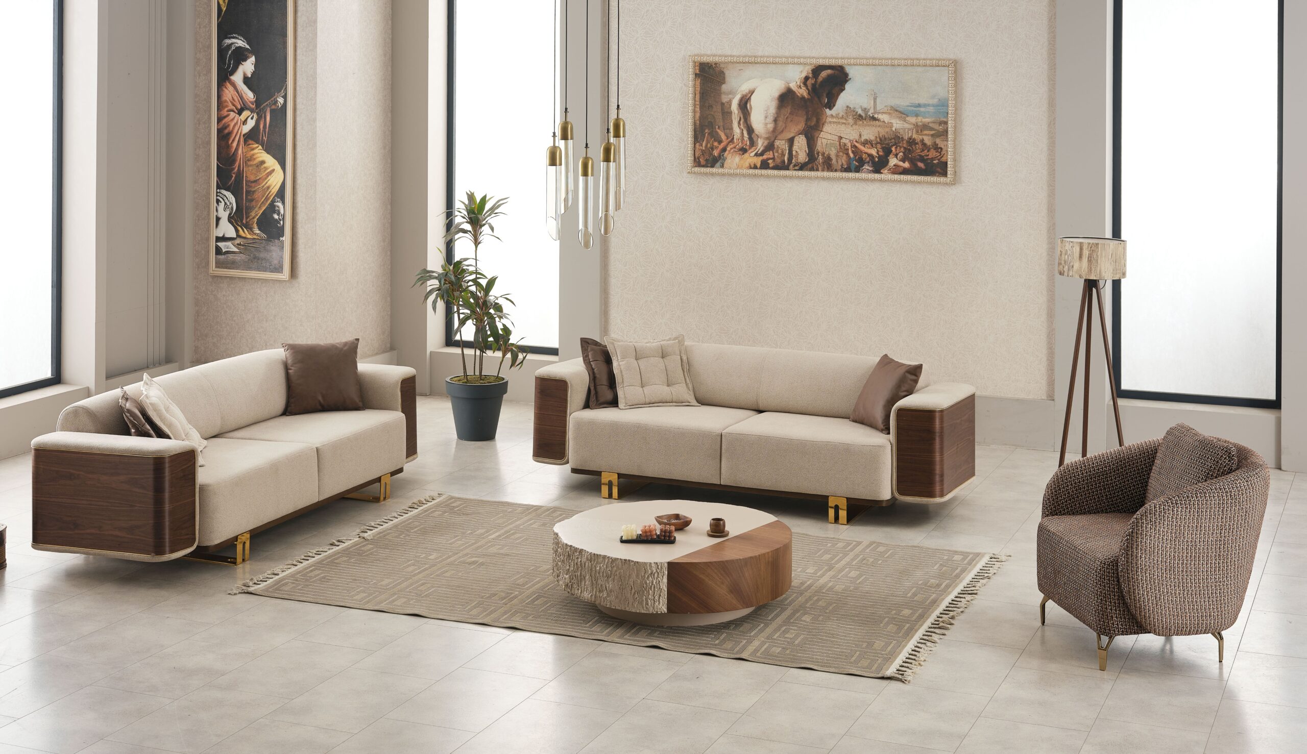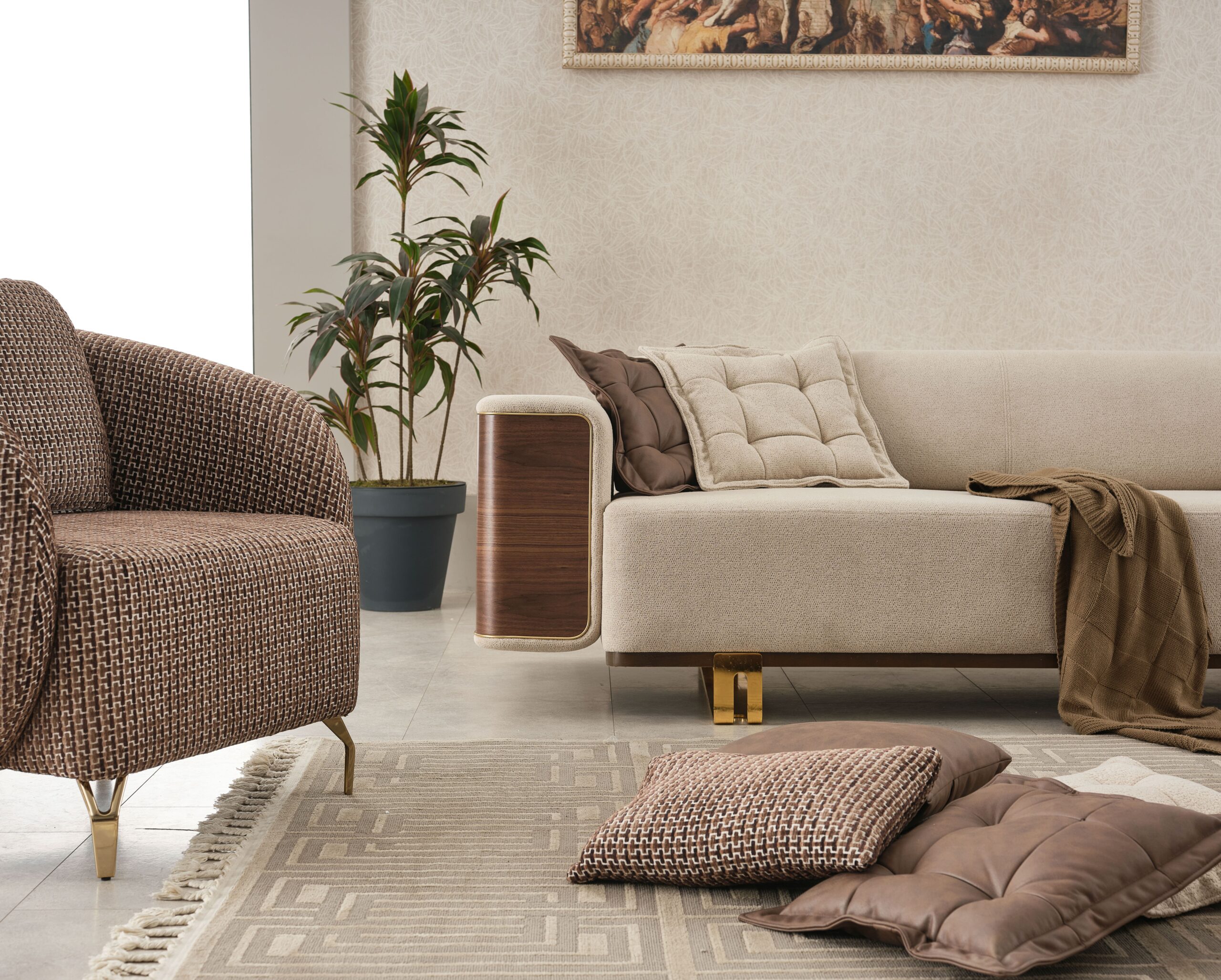 Apportez une ambiance chaleureuse et sophistiquée à votre intérieur avec cet ensemble de salon contemporain alliant tissu beige raffiné, finitions effet bois et détails métalliques dorés. Un design haut de gamme qui marie modernité et esprit naturel pour un rendu visuel très élégant.