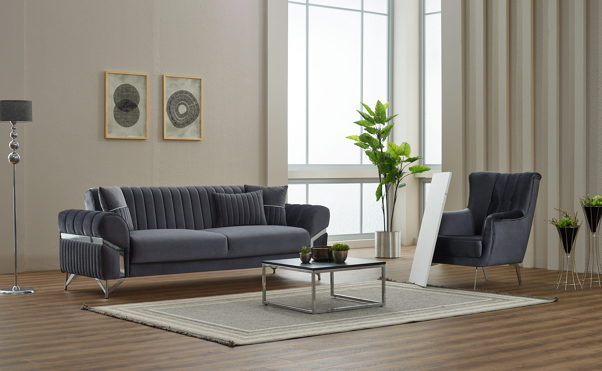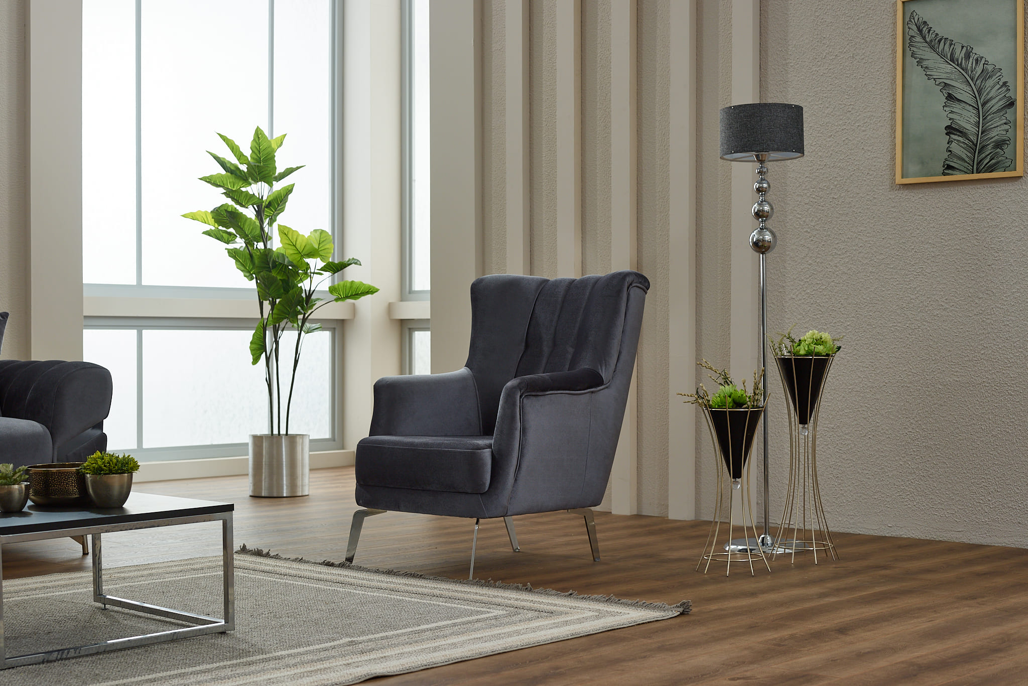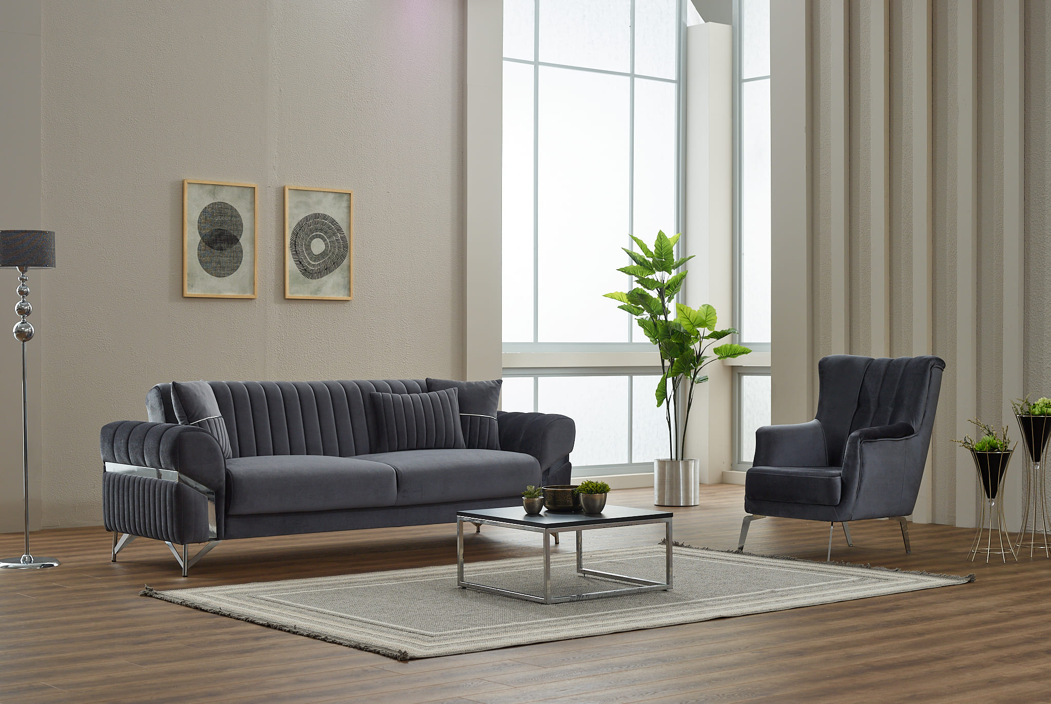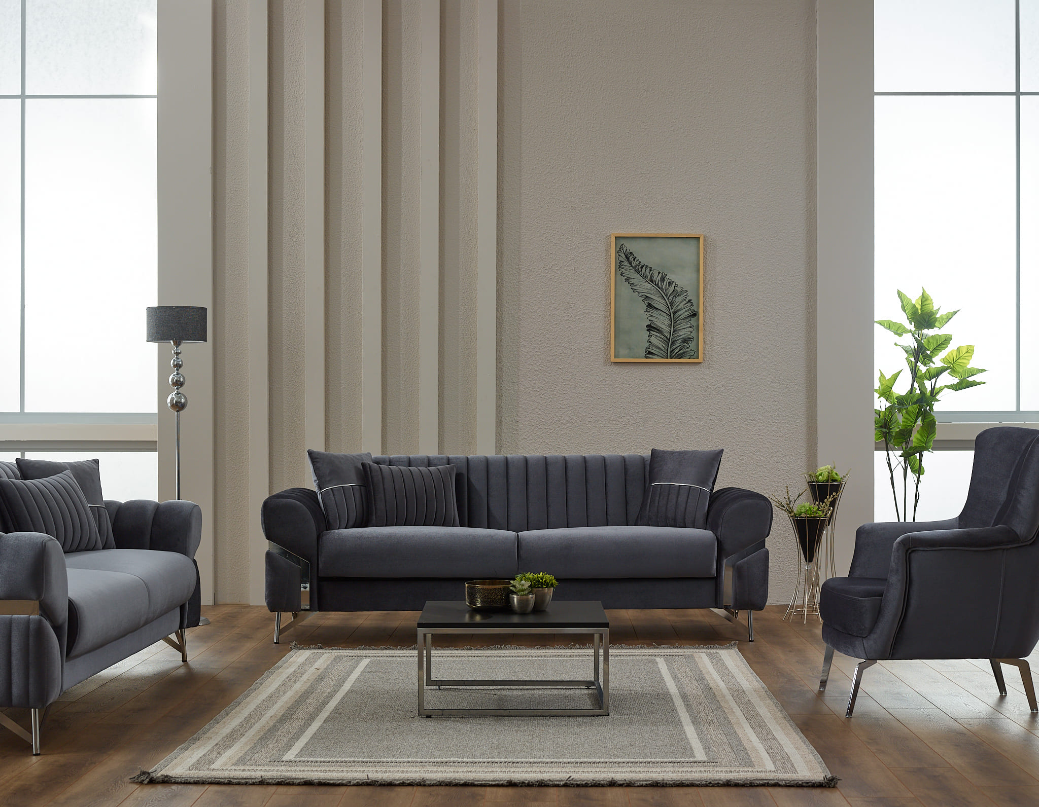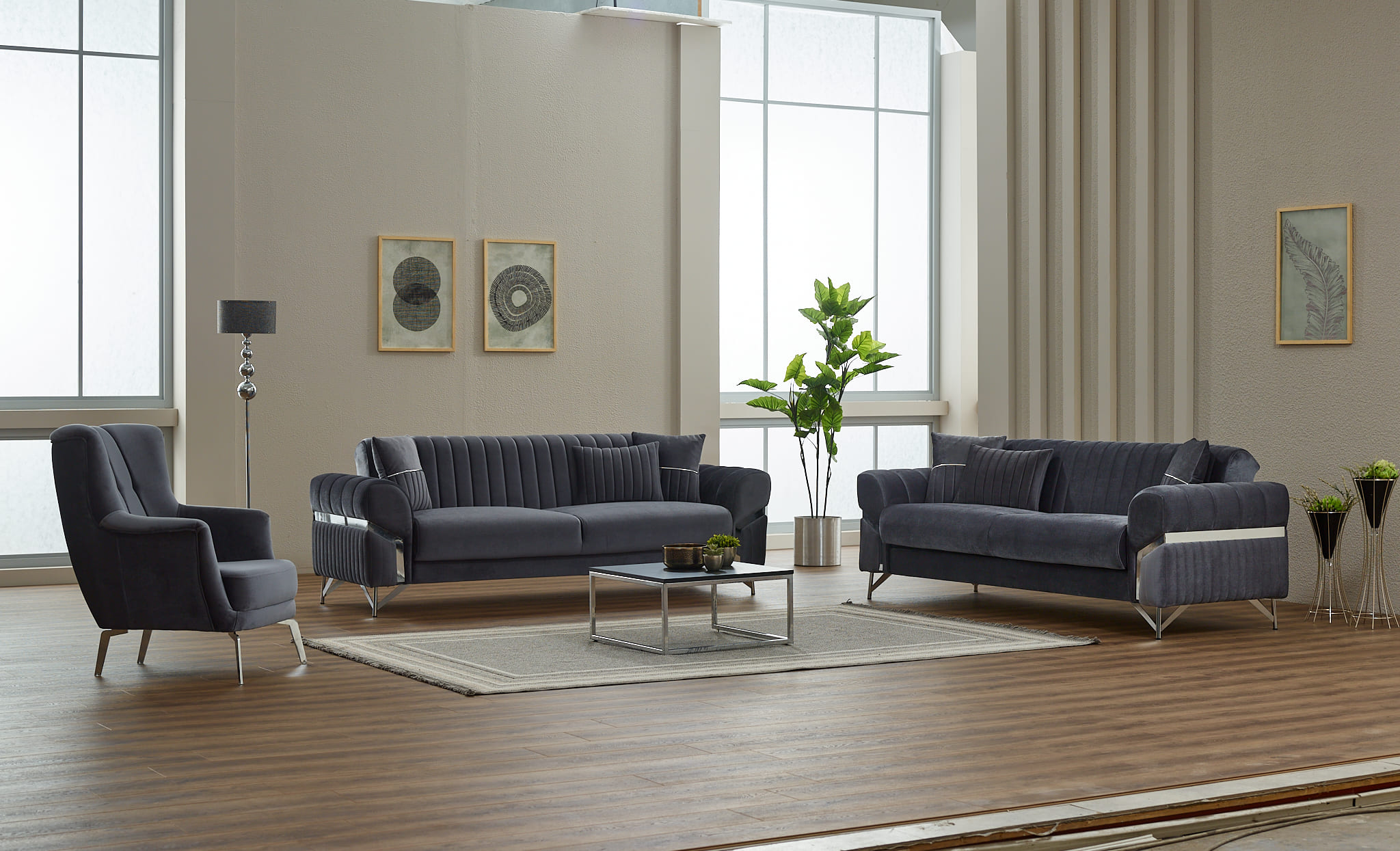 Composé de deux canapés et d’un fauteuil assorti, cet ensemble se distingue par ses dossiers capitonnés verticaux, ses accoudoirs stylisés avec détails décoratifs et ses pieds métalliques design qui apportent légèreté visuelle et stabilité. Sa teinte gris profond s’intègre facilement dans les intérieurs modernes, industriels ou minimalistes.